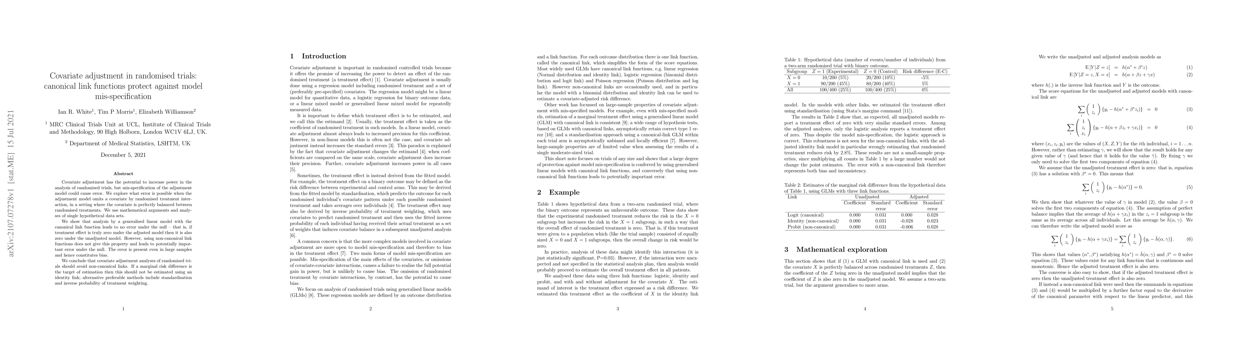This paper demonstrates that using canonical link functions in generalised linear models for covariate adjustment in randomised trials protects against model mis-specification errors. Non-canonical link functions can introduce bias even in large samples, whereas canonical links ensure treatment effects are correctly identified under the null hypothesis.