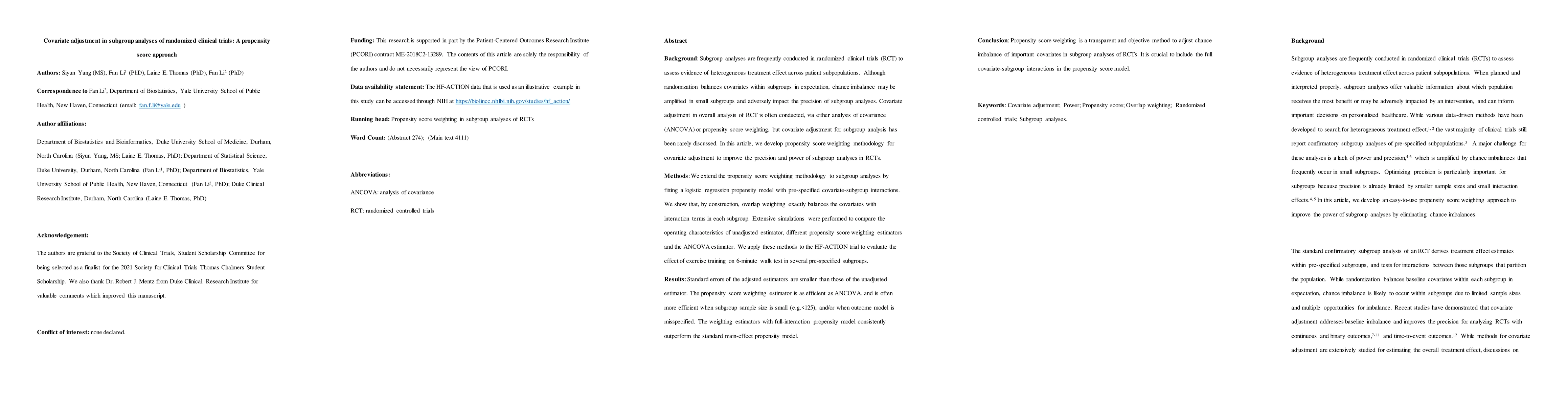 This paper develops a propensity score weighting methodology to adjust for covariates in subgroup analyses of randomized clinical trials, improving precision and power. The proposed method balances covariates within subgroups and is shown to be efficient, especially in small subgroups, through extensive simulations and application to the HF-ACTION trial.