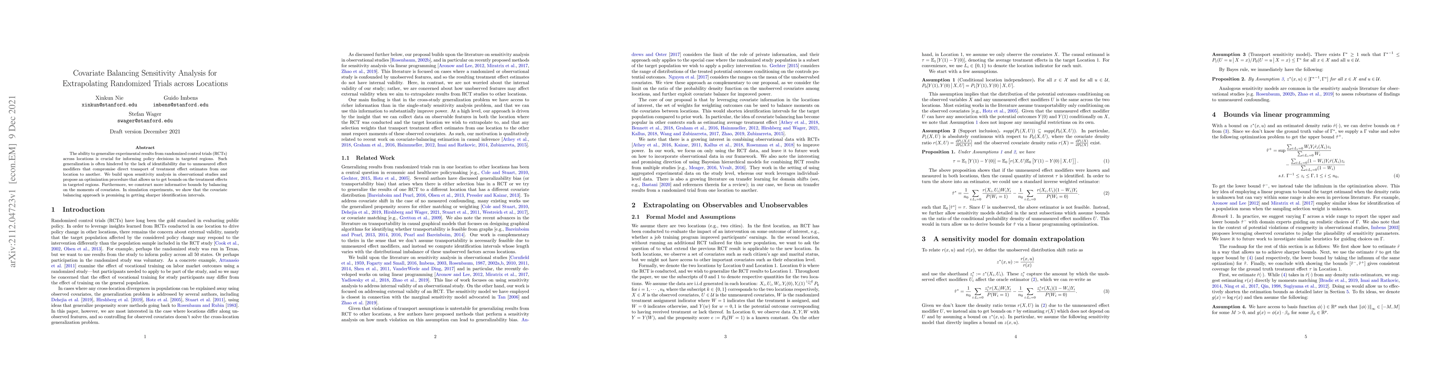 The ability to generalize experimental results from randomized control trials (RCTs) across locations is crucial for informing policy decisions in targeted regions. Such generalization is often hindered by the lack of identifiability due to unmeasured effect modifiers that compromise direct transport of treatment effect estimates from one location to another. We build upon sensitivity analysis in observational studies and propose an optimization procedure that allows us to get bounds on the treatment effects in targeted regions. Furthermore, we construct more informative bounds by balancing on the moments of covariates. In simulation experiments, we show that the covariate balancing approach is promising in getting sharper identification intervals.