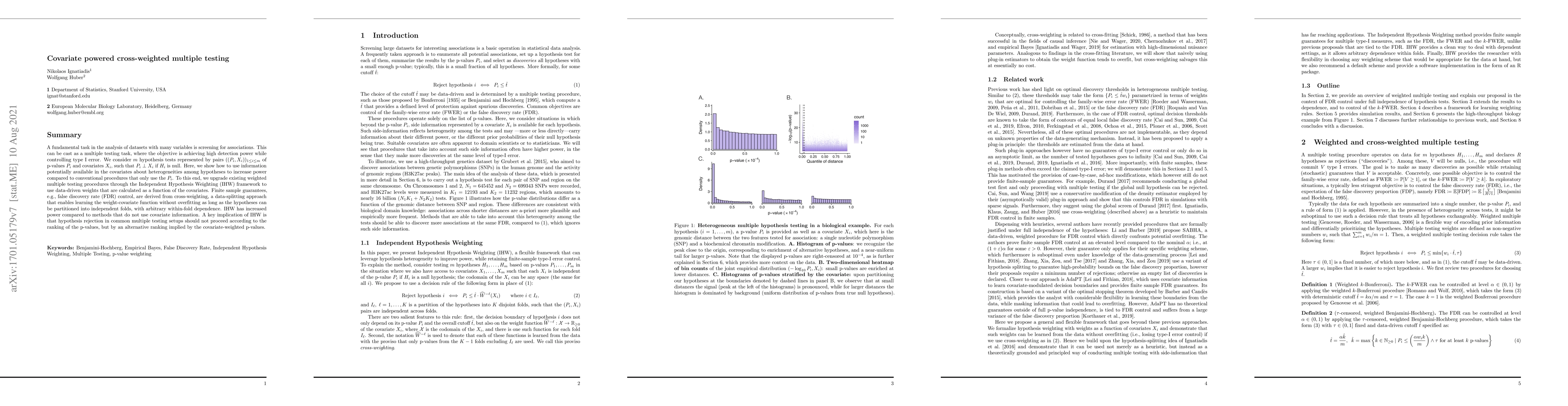 The research introduces a method called Independent Hypothesis Weighting (IHW) that utilizes data-driven weights based on covariates to increase power in multiple testing, particularly in genome-scale testing. It leverages cross-weighting, a data-splitting approach ensuring finite-sample FDR control without overfitting.