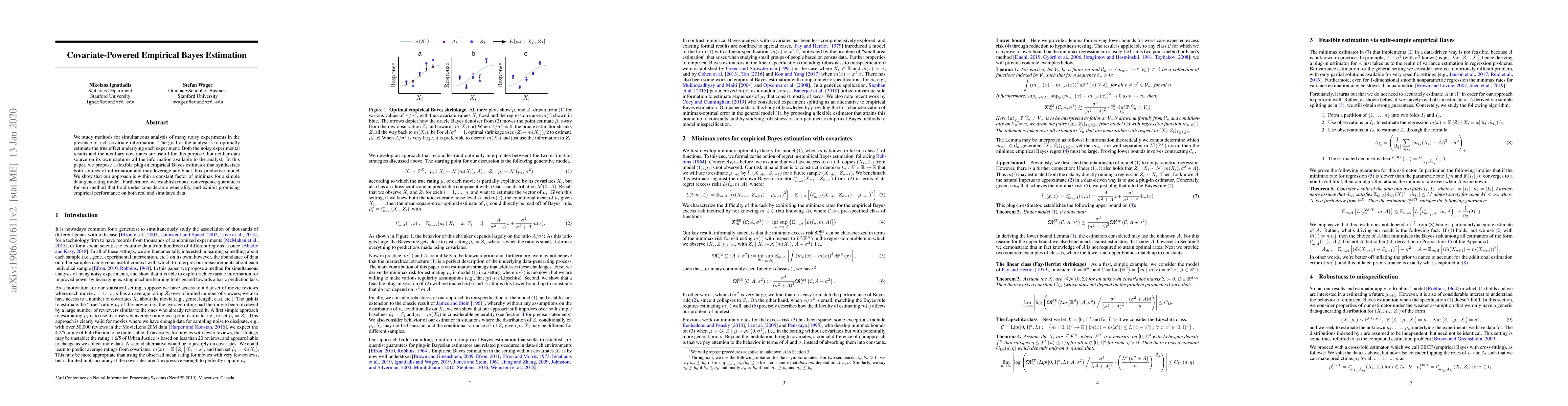 We study methods for simultaneous analysis of many noisy experiments in the presence of rich covariate information. The goal of the analyst is to optimally estimate the true effect underlying each experiment. Both the noisy experimental results and the auxiliary covariates are useful for this purpose, but neither data source on its own captures all the information available to the analyst. In this paper, we propose a flexible plug-in empirical Bayes estimator that synthesizes both sources of information and may leverage any black-box predictive model. We show that our approach is within a constant factor of minimax for a simple data-generating model. Furthermore, we establish robust convergence guarantees for our method that hold under considerable generality, and exhibit promising empirical performance on both real and simulated data.