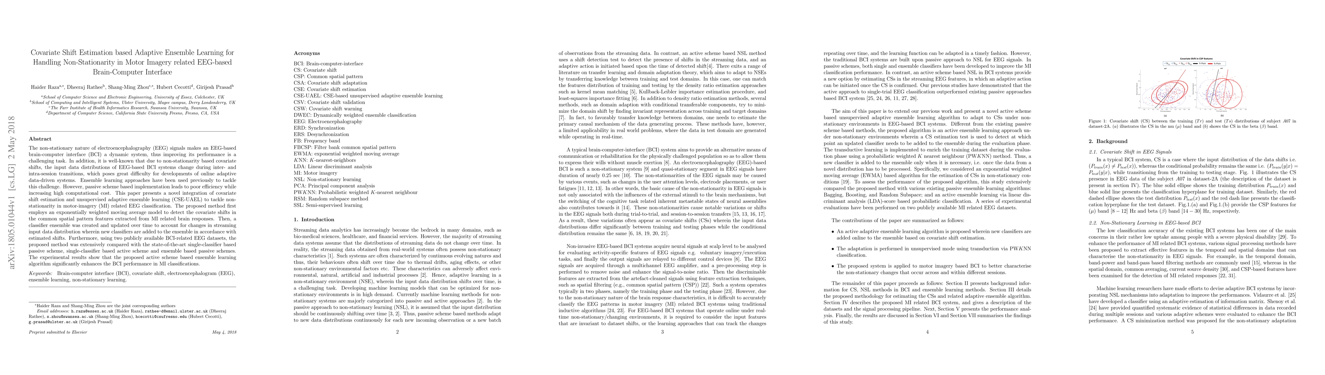 This paper proposes a novel Covariate Shift Estimation based Adaptive Ensemble Learning (CSE-UAEL) method to improve the performance of EEG-based brain-computer interfaces (BCI) by addressing non-stationarity. The CSE-UAEL method dynamically updates an ensemble of classifiers to adapt to covariate shifts in EEG signals, significantly outperforming passive ensemble schemes.