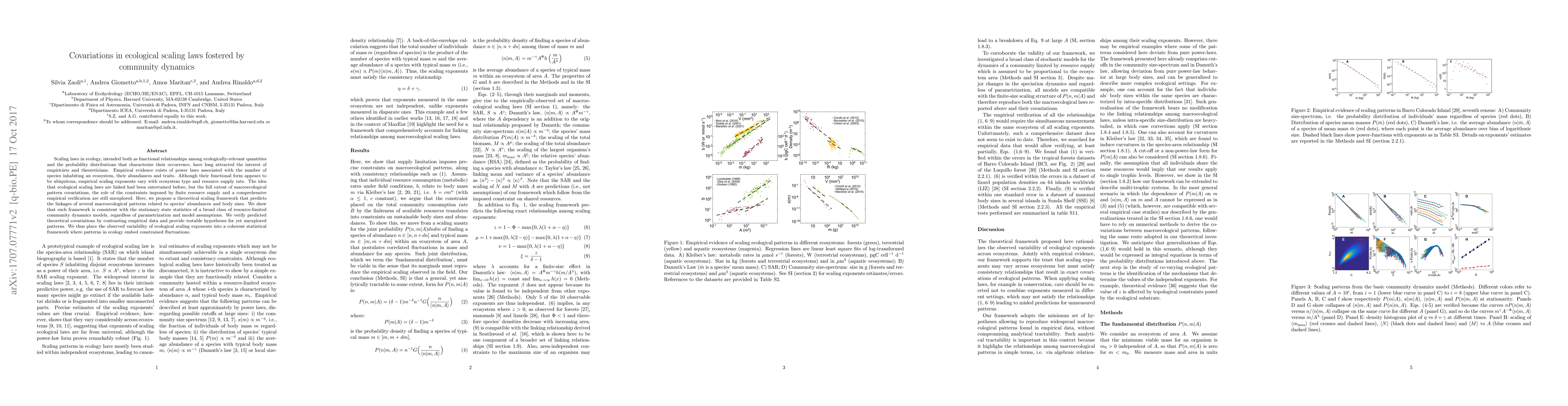 This paper proposes a theoretical framework linking various macroecological patterns, such as species abundances and body sizes, within a community dynamics model. It demonstrates that these patterns covary under resource-limited conditions, providing a coherent statistical explanation for the observed variability in ecological scaling laws.