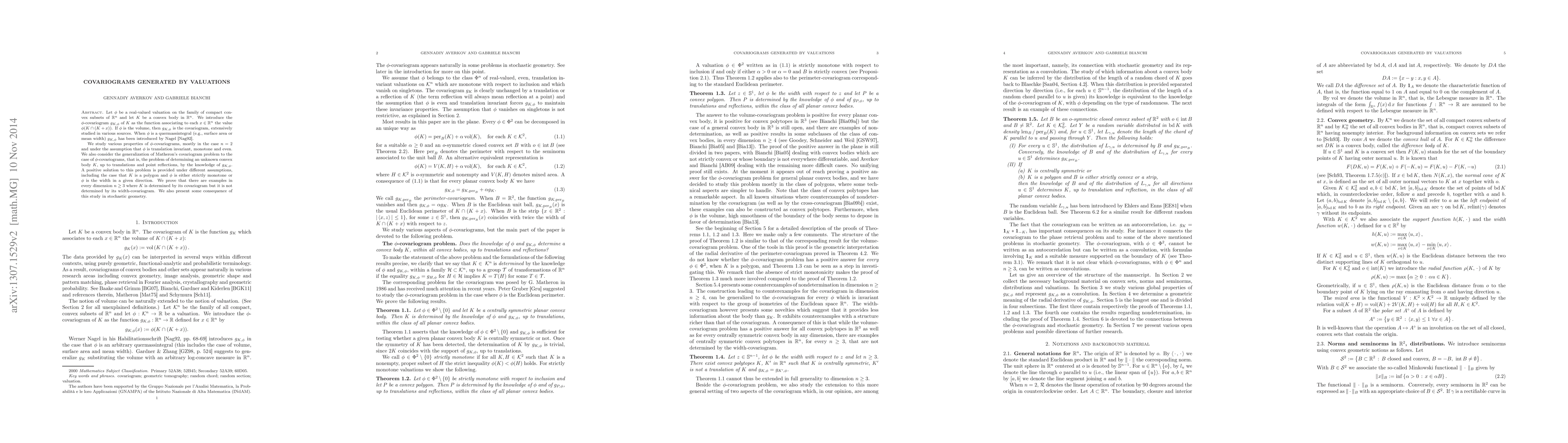 Let \phi be a real-valued valuation on the family of compact convex subsets of \mathbb{R}^n and let K be a convex body in \mathbb{R}^n. We introduce the \phi -covariogram g_{K,\phi} of K as the function associating to each x \in \mathbb{R}^n the value \phi(K \cap (K+x)). If \phi is the volume, then g_{K,\phi} is the covariogram, extensively studied in various sources. When \phi is a quermassintegral (e.g., surface area or mean width) g_{K,\phi} has been introduced by Nagel. We study various properties of \phi -covariograms, mostly in the case n=2 and under the assumption that \phi is translation invariant, monotone and even. We also consider the generalization of Matheron's covariogram problem to the case of \phi -covariograms, that is, the problem of determining an unknown convex body K, up to translations and point reflections, by the knowledge of g_{K,\phi}. A positive solution to this problem is provided under different assumptions, including the case that K is a polygon and \phi is either strictly monotone or \phi is the width in a given direction. We prove that there are examples in every dimension n\geq3 where K is determined by its covariogram but it is not determined by its width-covariogram. We also present some consequence of this study in stochastic geometry.