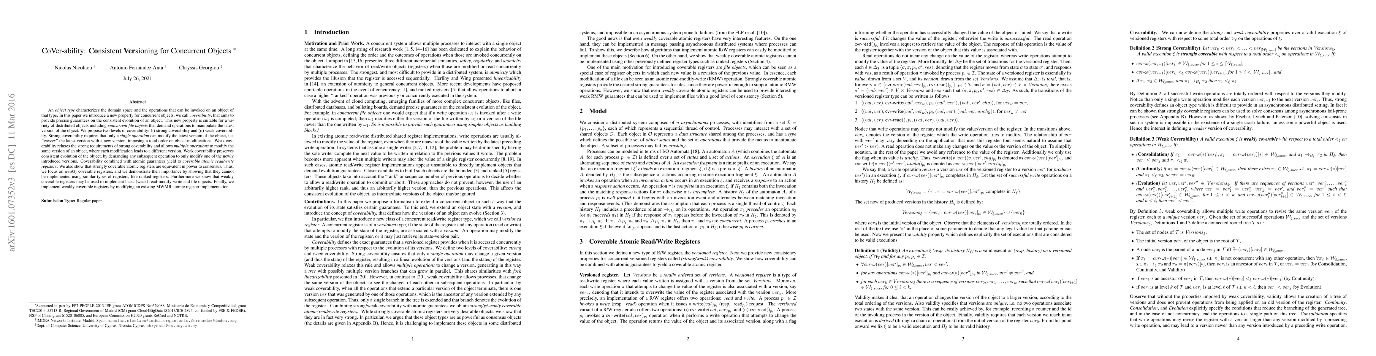 An object type characterizes the domain space and the operations that can be invoked on an object of that type. In this paper we introduce a new property for concurrent objects, we call coverability, that aims to provide precise guarantees on the consistent evolution of an object. This new property is suitable for a variety of distributed objects including concurrent file objects that demand operations to manipulate the latest version of the object. We propose two levels of coverability: (i) strong coverability and (ii) weak coverability. Strong coverability requires that only a single operation can modify the latest version of the object, i.e. "covers" the latest version with a new version, imposing a total order on object modifications. Weak coverability relaxes the strong requirements of strong coverability and allows multiple operations to modify the same version of an object, where each modification leads to a different version. Weak coverability preserves consistent evolution of the object, by demanding any subsequent operation to only modify one of the newly introduced versions. Coverability combined with atomic guarantees yield to coverable atomic read/write registers. We also show that strongly coverable atomic registers are equivalent in power to consensus. Thus, we focus on weakly coverable registers, and we demonstrate their importance by showing that they cannot be implemented using similar types of registers, like ranked-registers. Furthermore we show that weakly coverable registers may be used to implement basic (weak) read-modify-write and file objects. Finally, we implement weakly coverable registers by modifying an existing MWMR atomic register implementation.