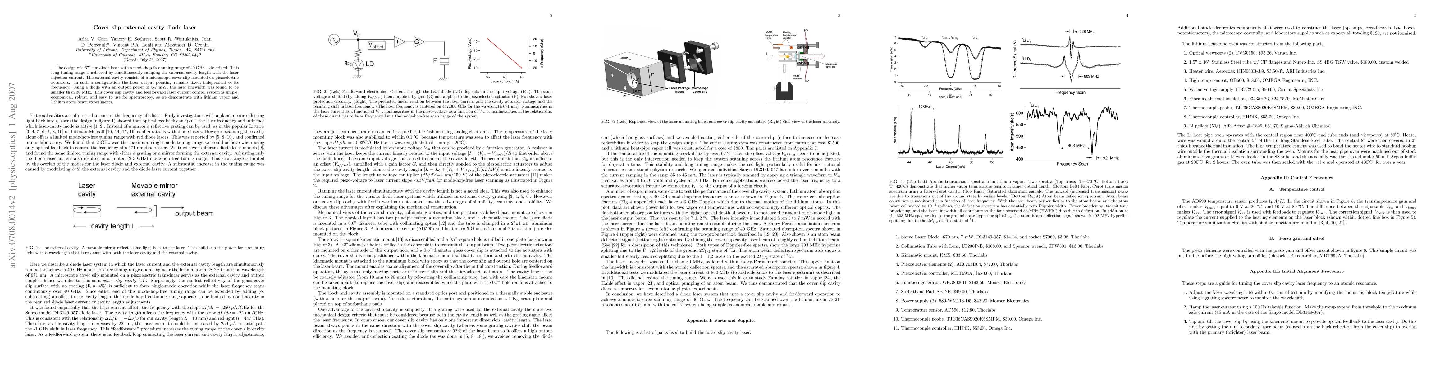 This paper describes a 671 nm diode laser with a 40 GHz tuning range achieved by adjusting the external cavity length and injection current. The design features a cover slip on piezoelectric actuators to maintain fixed laser output pointing, resulting in a laser linewidth under 30 MHz and making it suitable for spectroscopy applications.