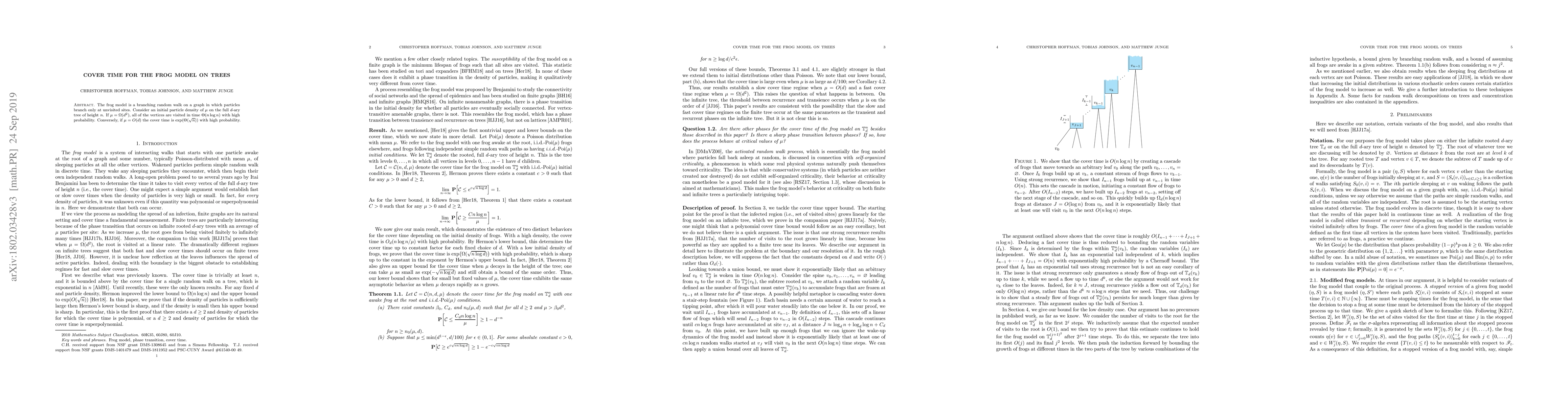 The frog model is a branching random walk on a graph in which particles branch only at unvisited sites. Consider an initial particle density of $\mu$ on the full $d$-ary tree of height $n$. If $\mu= \Omega( d^2)$, all of the vertices are visited in time $\Theta(n\log n)$ with high probability. Conversely, if $\mu = O(d)$ the cover time is $\exp(\Theta(\sqrt n))$ with high probability.
