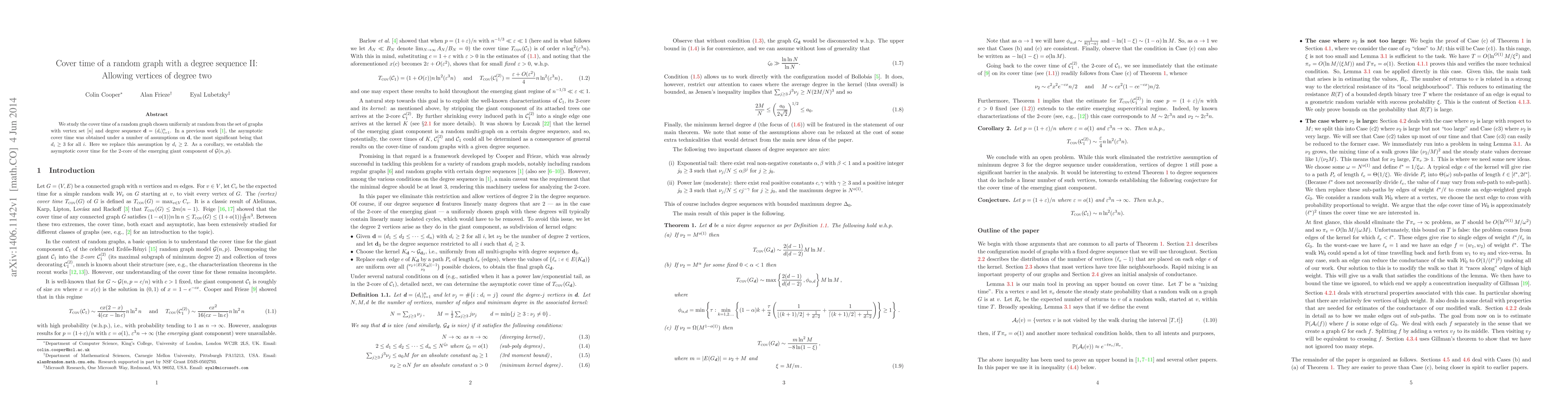 We study the cover time of a random graph chosen uniformly at random from the set of graphs with vertex set $[n]$ and degree sequence $\mathbf{d}=(d_i)_{i=1}^n$. In a previous work, the asymptotic cover time was obtained under a number of assumptions on $\mathbf{d}$, the most significant being that $d_i\geq 3$ for all $i$. Here we replace this assumption by $d_i\geq 2$. As a corollary, we establish the asymptotic cover time for the 2-core of the emerging giant component of $\mathcal{G}(n,p)$.