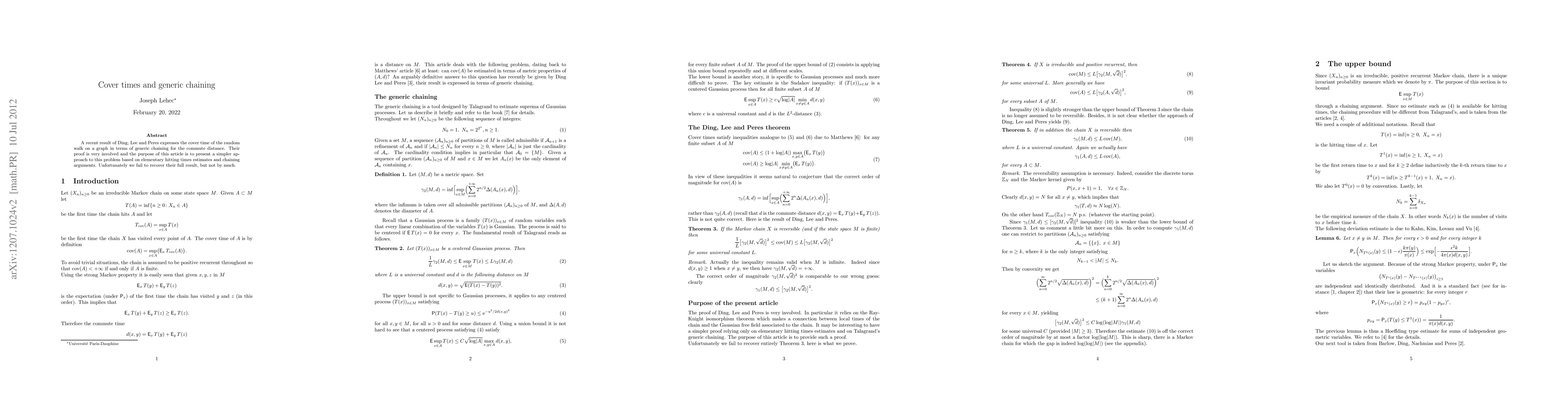A recent result of Ding, Lee and Peres expresses the cover time of the random walk on a graph in terms of generic chaining for the commute distance. Their proof is very involved and the purpose of this article is to present a simpler approach to this problem based on elementary hitting times estimates and chaining arguments. Unfortunately we fail to recover their full result, but not by much.