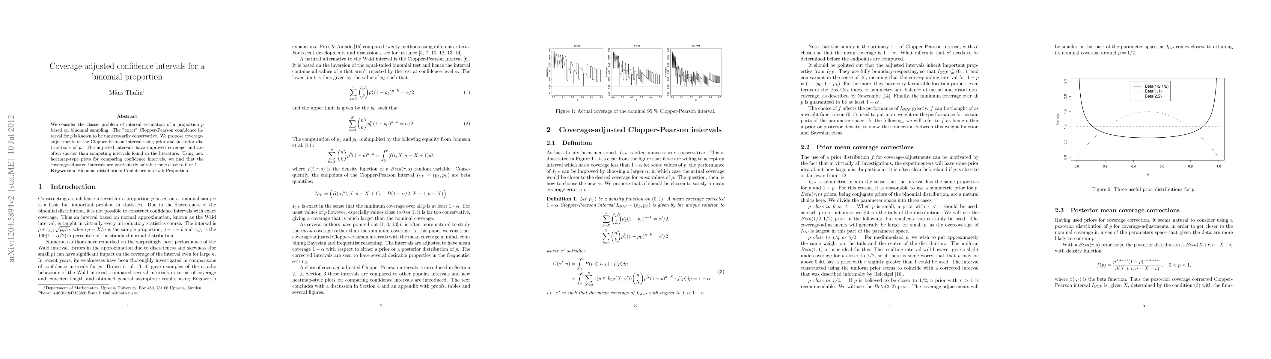 This paper proposes coverage-adjusted confidence intervals for estimating a binomial proportion, improving upon the conservative Clopper-Pearson method. The adjusted intervals, derived using prior and posterior distributions, show better coverage and often shorter lengths, especially for proportions near 0 or 1.