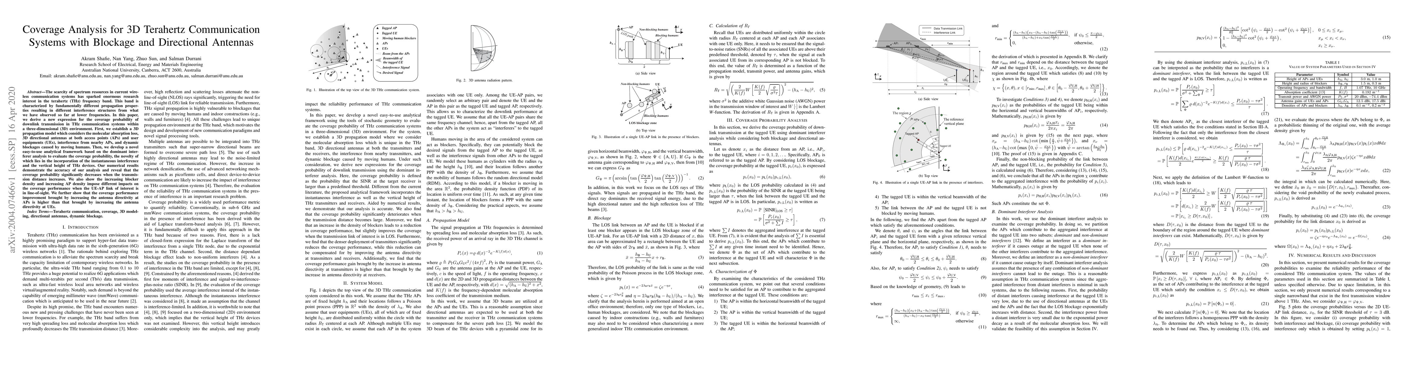This paper develops a 3D propagation model for terahertz communication systems, incorporating directional antennas, molecular absorption, and dynamic blockages. It presents an analytical framework to evaluate coverage probability, showing significant decreases with increased transmission distance and different impacts of blocker and AP densities on coverage performance.