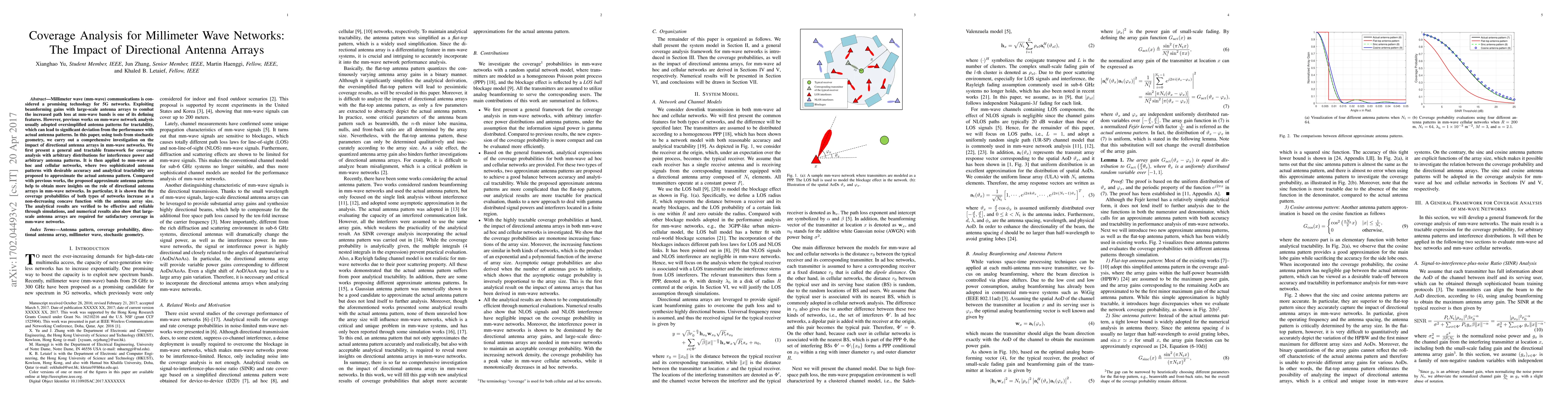 This paper investigates the impact of directional antenna arrays on coverage in millimeter wave (mm-wave) networks using stochastic geometry. It proposes a framework for coverage analysis with accurate antenna patterns, revealing that coverage probabilities increase with antenna array size, and validates the findings through simulations.