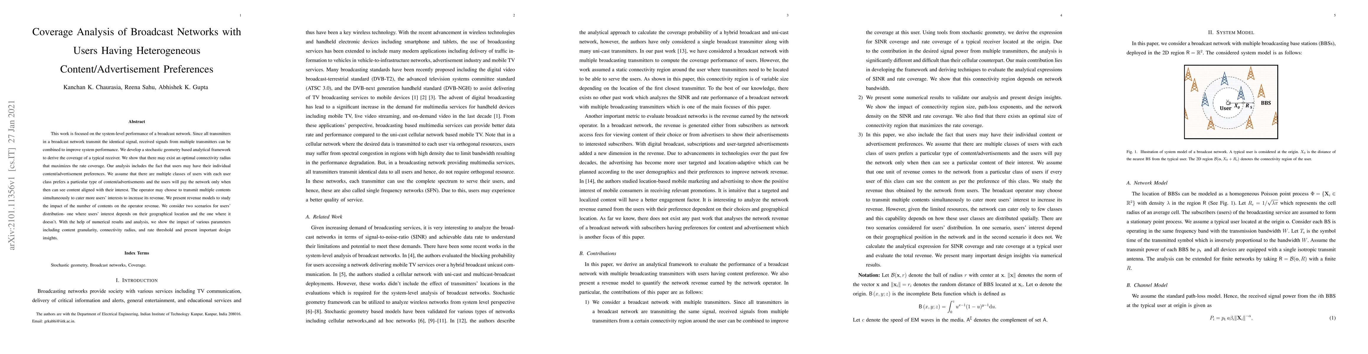 This work is focused on the system-level performance of a broadcast network. Since all transmitters in a broadcast network transmit the identical signal, received signals from multiple transmitters can be combined to improve system performance. We develop a stochastic geometry based analytical framework to derive the coverage of a typical receiver. We show that there may exist an optimal connectivity radius that maximizes the rate coverage. Our analysis includes the fact that users may have their individual content/advertisement preferences. We assume that there are multiple classes of users with each user class prefers a particular type of content/advertisements and the users will pay the network only when then can see content aligned with their interest. The operator may choose to transmit multiple contents simultaneously to cater more users' interests to increase its revenue. We present revenue models to study the impact of the number of contents on the operator revenue. We consider two scenarios for users' distribution: one where users' interest depends on their geographical location and the one where it doesn't. With the help of numerical results and analysis, we show the impact of various parameters including content granularity, connectivity radius, and rate threshold and present important design insights.