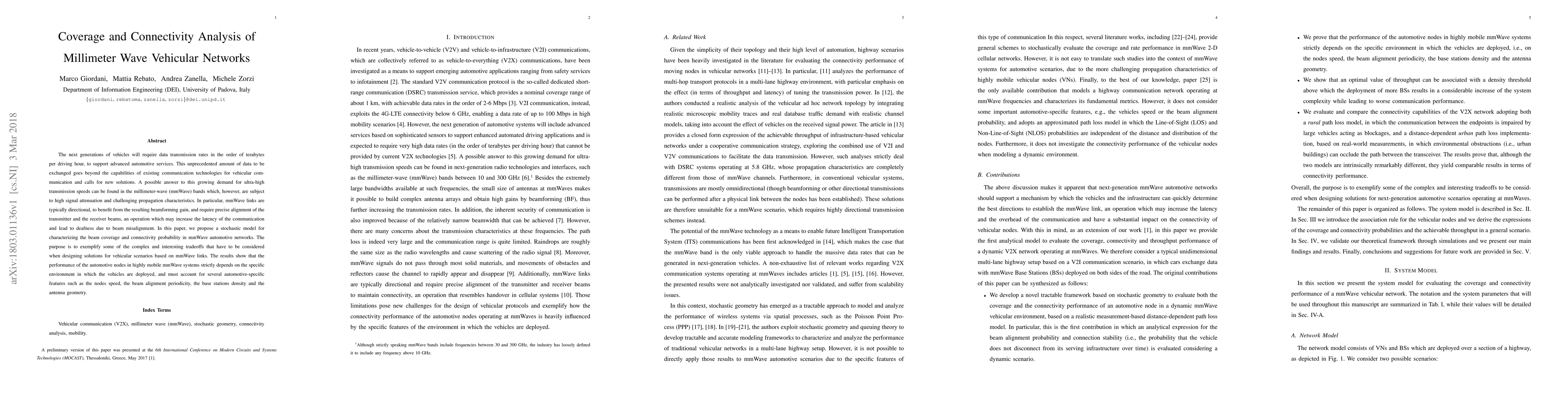 The paper proposes a stochastic geometry framework to characterize the coverage and connectivity performance of dynamic mmWave vehicular networks along multi-lane highways, modeling base stations as independent homogeneous 1D Poisson processes with rural and distance-dependent urban path loss models.