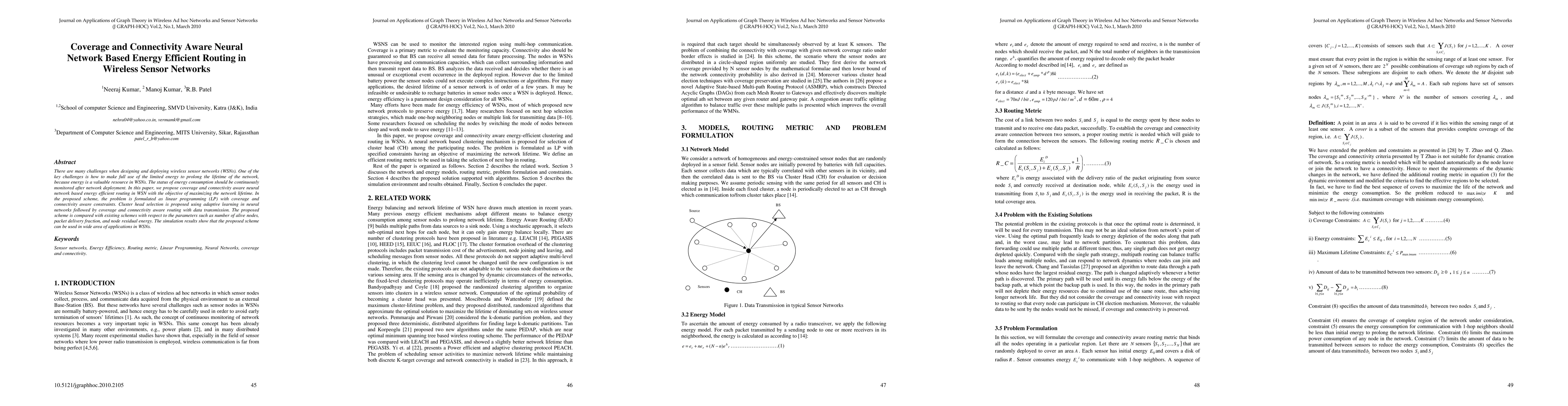 This paper proposes a neural network-based energy efficient routing scheme for wireless sensor networks (WSNs) that maximizes network lifetime by optimizing coverage and connectivity while monitoring energy consumption. The scheme uses adaptive learning for cluster head selection and coverage-aware routing, outperforming existing methods in terms of alive nodes, packet delivery, and residual energy.