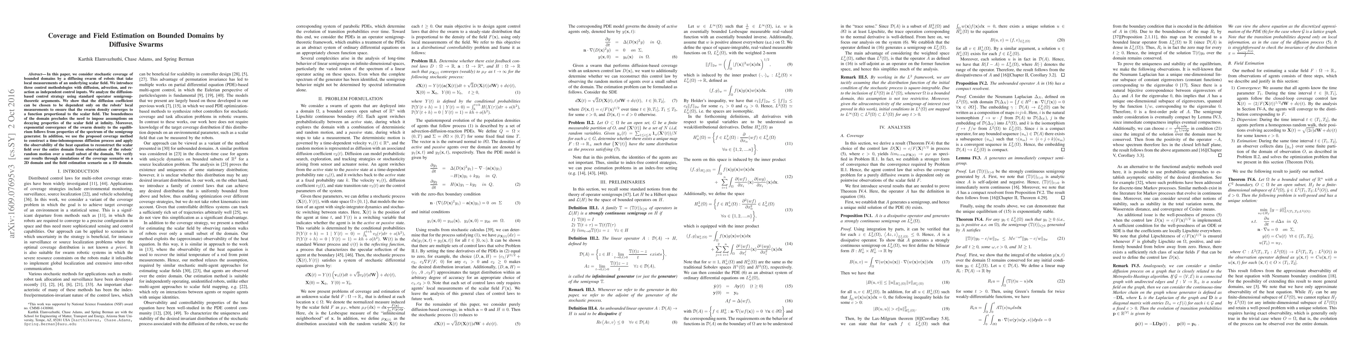 In this paper, we consider stochastic coverage of bounded domains by a diffusing swarm of robots that take local measurements of an underlying scalar field. We introduce three control methodologies with diffusion, advection, and reaction as independent control inputs. We analyze the diffusion-based control strategy using standard operator semigroup-theoretic arguments. We show that the diffusion coefficient can be chosen to be dependent only on the robots' local measurements to ensure that the swarm density converges to a function proportional to the scalar field. The boundedness of the domain precludes the need to impose assumptions on decaying properties of the scalar field at infinity. Moreover, exponential convergence of the swarm density to the equilibrium follows from properties of the spectrum of the semigroup generator. In addition, we use the proposed coverage method to construct a time-inhomogenous diffusion process and apply the observability of the heat equation to reconstruct the scalar field over the entire domain from observations of the robots' random motion over a small subset of the domain. We verify our results through simulations of the coverage scenario on a 2D domain and the field estimation scenario on a 1D domain.