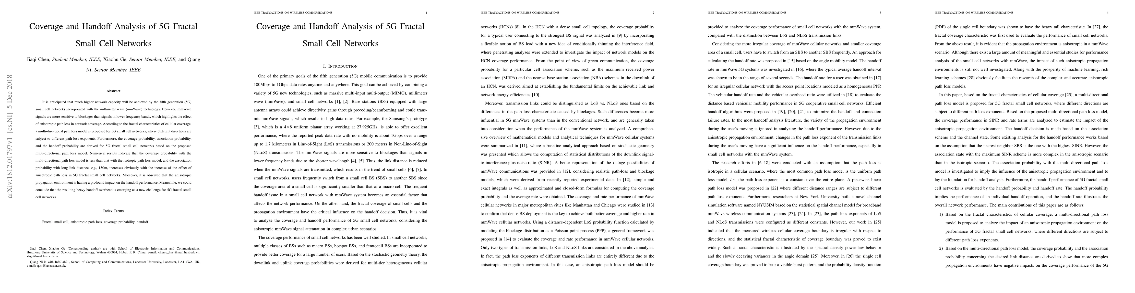 This paper proposes a multi-directional path loss model for 5G small cell networks using millimeter wave technology, analyzing coverage, association, and handoff probabilities. Results show that anisotropic path loss significantly impacts coverage and handoff performance, posing a new challenge for 5G fractal small cell networks.