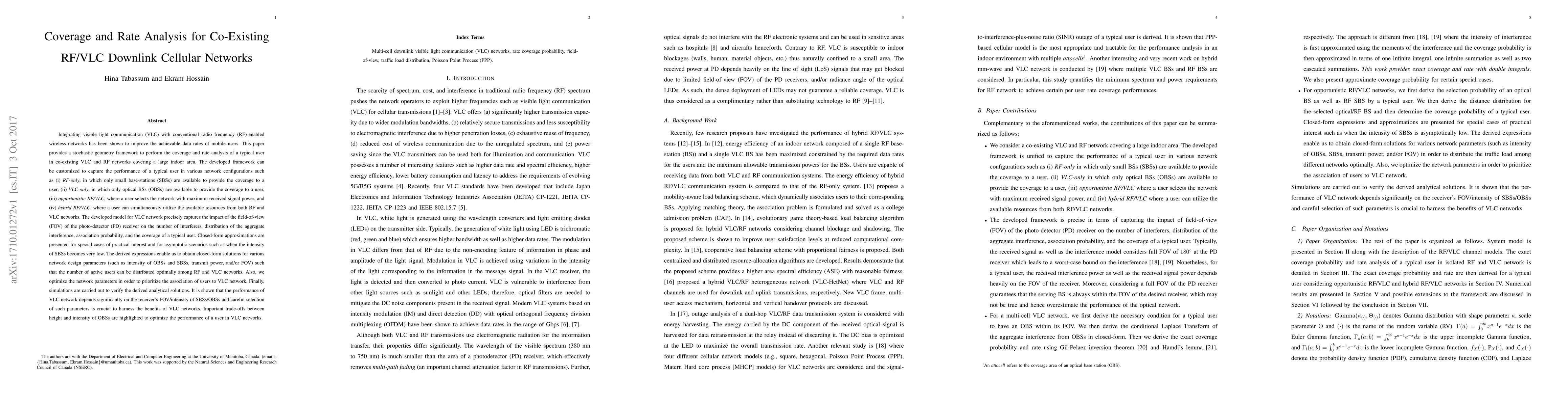 The paper presents a detailed stochastic geometry-based model for coverage and rate analysis of co-existing RF/VLC networks, providing closed-form expressions and optimization techniques for network parameters.