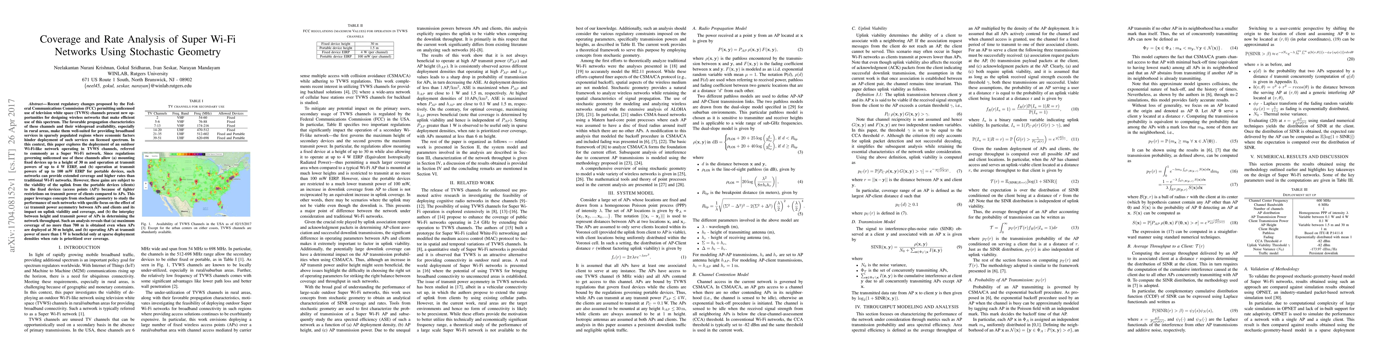 A stochastic geometry analysis was used to model and analyze the performance of a Wi-Fi-like network operating in TV white spaces.