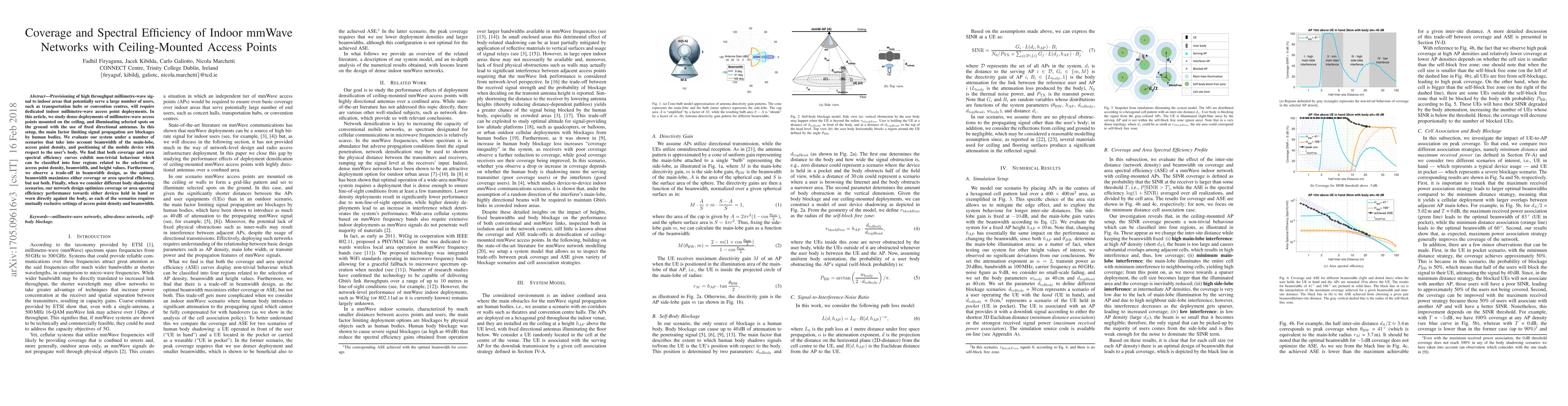 This paper investigates the coverage and spectral efficiency of indoor millimetre-wave networks with ceiling-mounted access points using directional antennas, focusing on scenarios with human body blockages. It identifies four distinct regions of performance based on access point density, beamwidth, and device positioning, highlighting a trade-off between coverage and spectral efficiency.