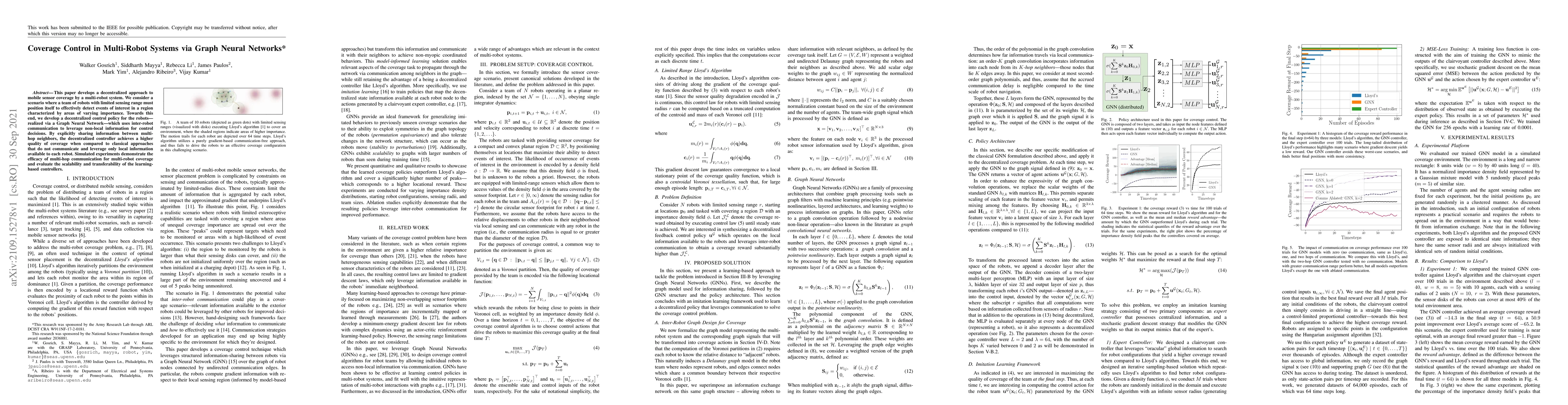 This paper develops a decentralized approach to mobile sensor coverage by a multi-robot system. We consider a scenario where a team of robots with limited sensing range must position itself to effectively detect events of interest in a region characterized by areas of varying importance. Towards this end, we develop a decentralized control policy for the robots -- realized via a Graph Neural Network -- which uses inter-robot communication to leverage non-local information for control decisions. By explicitly sharing information between multi-hop neighbors, the decentralized controller achieves a higher quality of coverage when compared to classical approaches that do not communicate and leverage only local information available to each robot. Simulated experiments demonstrate the efficacy of multi-hop communication for multi-robot coverage and evaluate the scalability and transferability of the learning-based controllers.