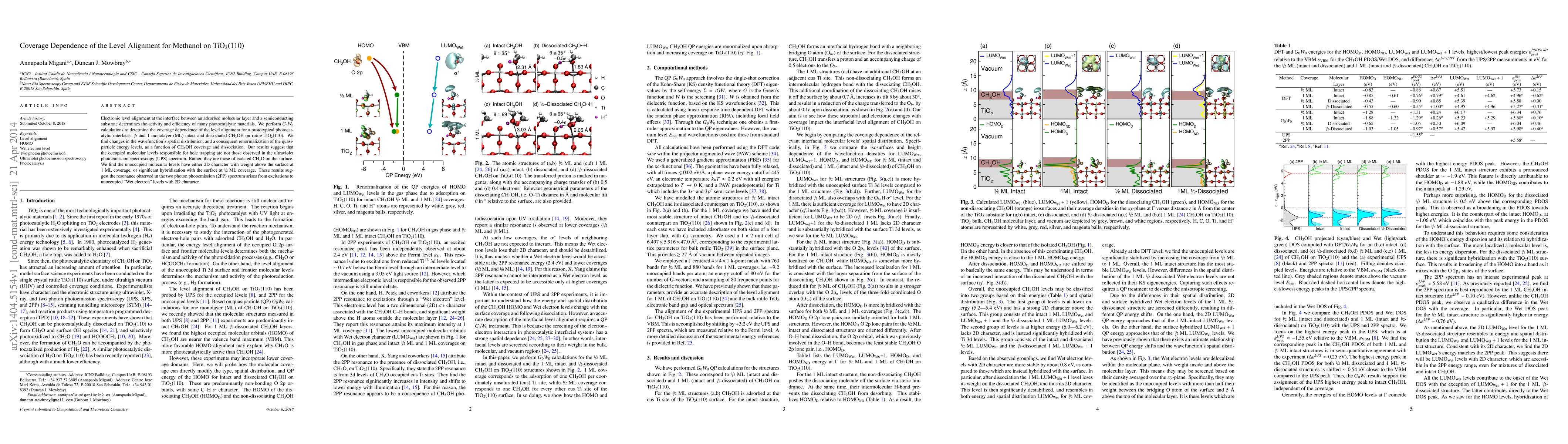 Electronic level alignment at the interface between an adsorbed molecular layer and a semiconducting substrate determines the activity and efficiency of many photocatalytic materials. We perform $G_0W_0$ calculations to determine the coverage dependence of the level alignment for a prototypical photocatalytic interface: 1/2 and 1 monolayer (ML) intact and dissociated CH$_3$OH on rutile TiO$_2$(110). We find changes in the wavefunction's spatial distribution, and a consequent renormalization of the quasiparticle energy levels, as a function of CH$_3$OH coverage and dissociation. Our results suggest that the occupied molecular levels responsible for hole trapping are not those observed in the ultraviolet photoemission spectroscopy (UPS) spectrum. Rather, they are those of isolated CH$_3$O on the surface. We find the unoccupied molecular levels have either 2D character with weight above the surface at 1 ML coverage, or significant hybridization with the surface at 1/2 ML coverage. These results suggest the resonance observed in the two photon phooemission (2PP) spectrum arises from excitations to unoccupied "Wet electron" levels with 2D character.