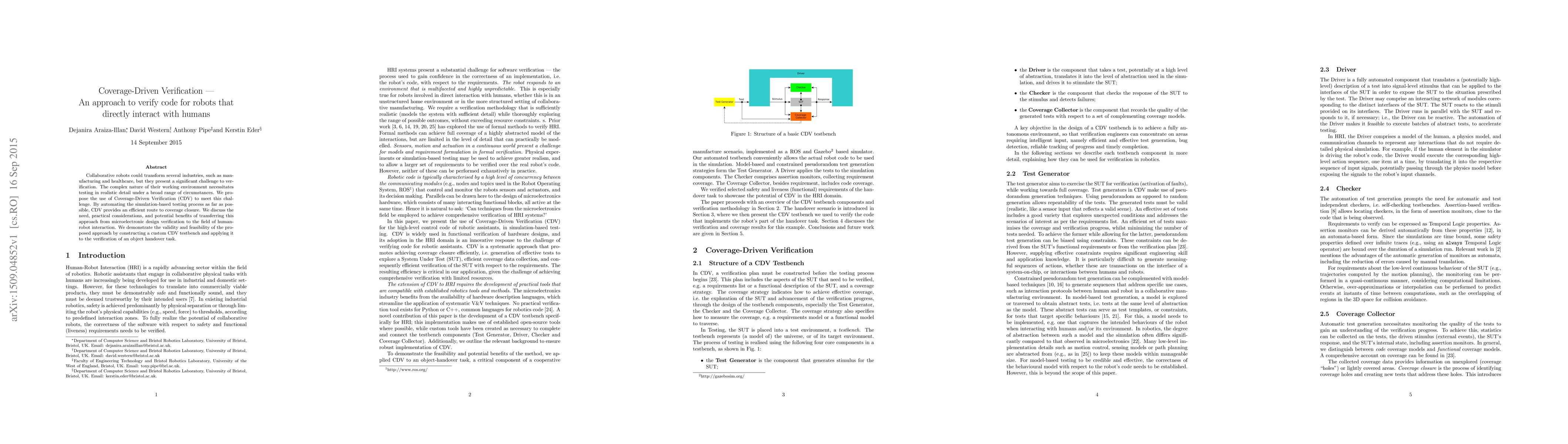Researchers propose Coverage-Driven Verification to test robots that interact with humans, aiming to improve safety and efficiency in industries like manufacturing and healthcare. They demonstrate the approach's validity through a custom testbench for object handover tasks.