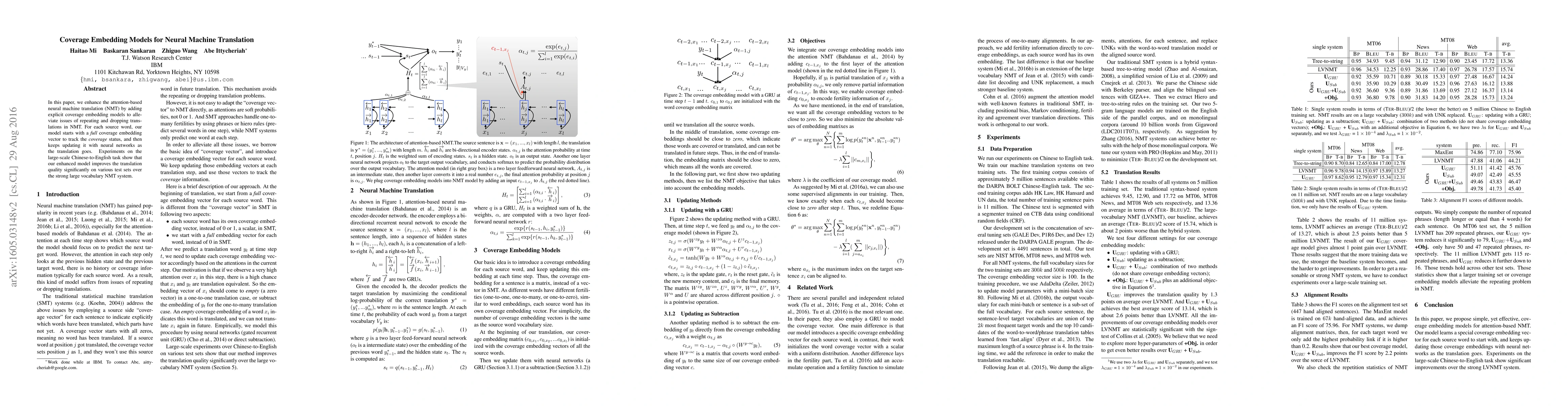 This paper introduces coverage embedding models to improve attention-based neural machine translation by tracking and updating coverage status for each source word, reducing translation repetitions and omissions. Experiments demonstrate significant quality improvements in Chinese-to-English translation over existing large vocabulary NMT systems.