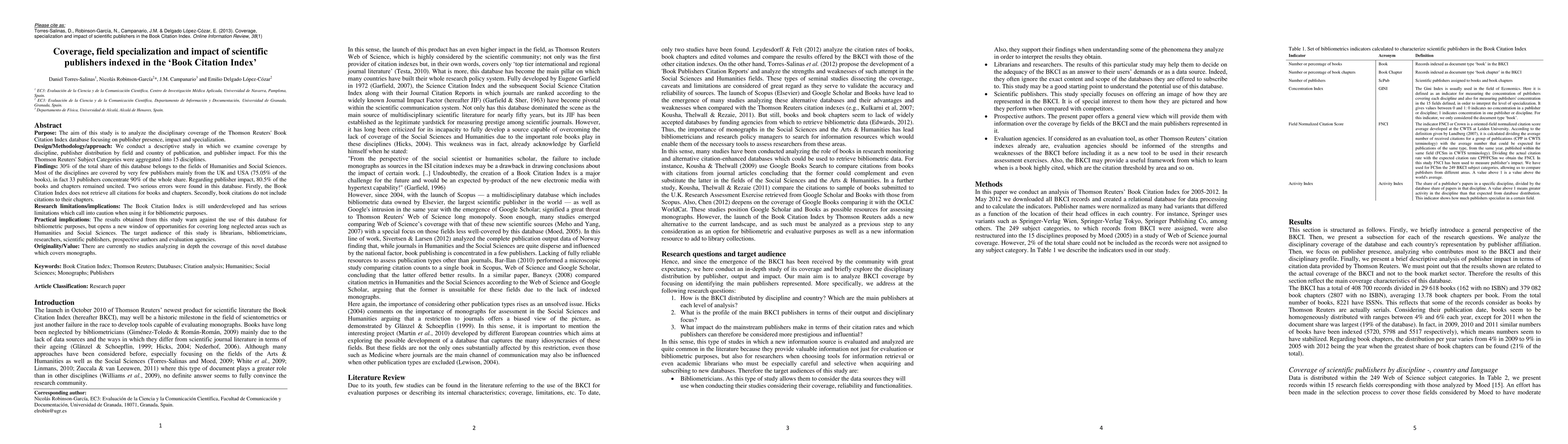 This study analyzes the coverage and impact of publishers in Thomson Reuters' Book Citation Index, highlighting a significant presence of UK and US publishers in Humanities and Social Sciences, though 80.5% of books remain uncited. It cautions against using this underdeveloped database for bibliometric analysis due to citation retrieval errors.