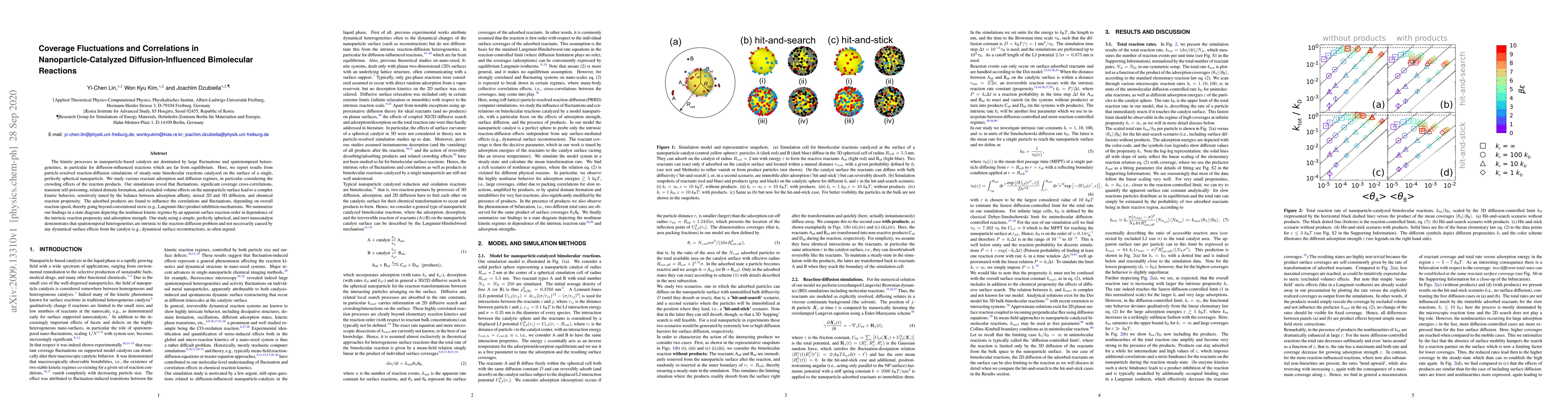The kinetic processes in nanoparticle-based catalysis are dominated by large fluctuations and spatiotemporal heterogeneities, in particular for diffusion-influenced reactions which are far from equilibrium. Here, we report results from particle-resolved reaction-diffusion simulations of steady-state bimolecular reactions catalyzed on the surface of a single, perfectly spherical nanoparticle. We study various reactant adsorption and diffusion regimes, in particular considering the crowding effects of the reaction products. Our simulations reveal that fluctuations, significant coverage cross-correlations, transient self-poisoning, related domain formation, and excluded-volume effects on the nanoparticle surface lead to a complex kinetic behavior, sensitively tuned by the balance between adsorption affinity, mixed 2D and 3D diffusion, and chemical reaction propensity. The adsorbed products are found to influence the correlations and fluctuations, depending on overall reaction speed, thereby going beyond conventional steric (e.g., Langmuir-like) product inhibition mechanisms. We summarize our findings in a state diagram depicting the nonlinear kinetic regimes by an apparent surface reaction order in dependence of the intrinsic reaction propensity and adsorption strength. Our study using a simple, perfectly spherical, and inert nanocatalyst demonstrates that spatiotemporal heterogeneities are intrinsic to the reaction-diffusion problem and not necessarily caused by any dynamical surface effects from the catalyst (e.g., dynamical surface reconstruction), as often argued.