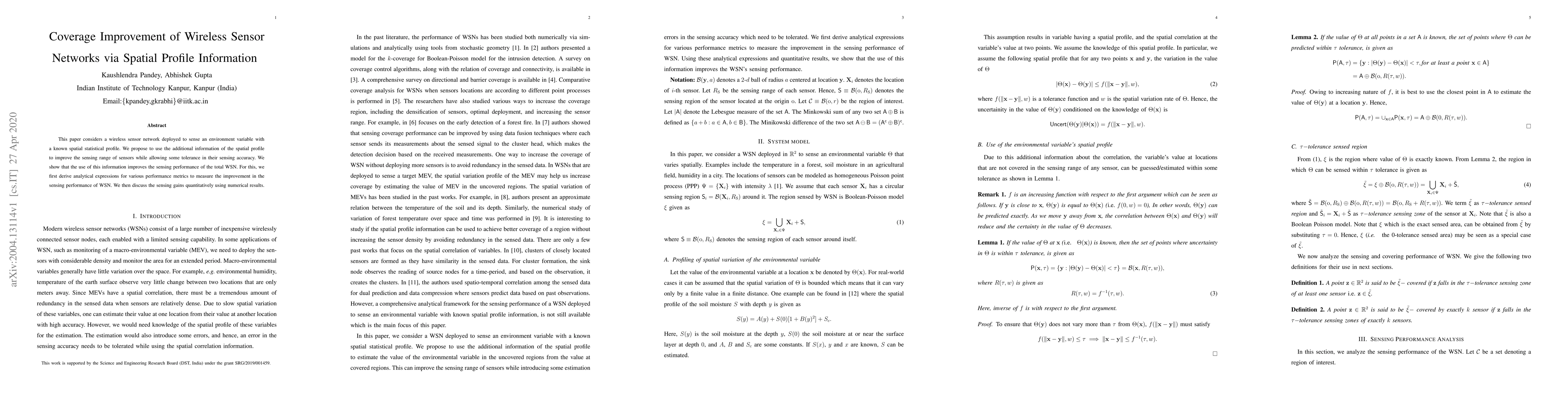 This paper proposes using spatial profile information to improve wireless sensor network coverage and accuracy, leading to enhanced overall performance. It provides analytical expressions and numerical results to quantify the benefits of this approach.