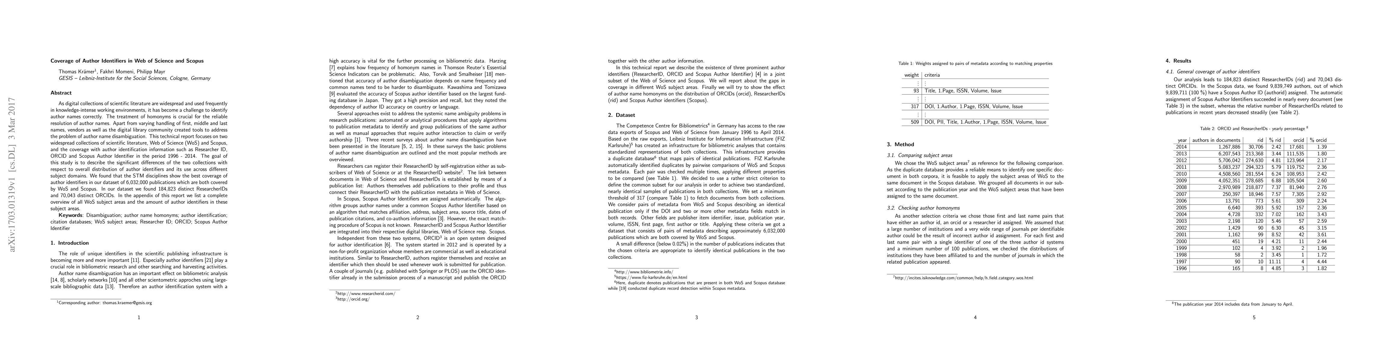 As digital collections of scientific literature are widespread and used frequently in knowledge-intense working environments, it has become a challenge to identify author names correctly. The treatment of homonyms is crucial for the reliable resolution of author names. Apart from varying handling of first, middle and last names, vendors as well as the digital library community created tools to address the problem of author name disambiguation. This technical report focuses on two widespread collections of scientific literature, Web of Science (WoS) and Scopus, and the coverage with author identification information such as Researcher ID, ORCID and Scopus Author Identifier in the period 1996 - 2014. The goal of this study is to describe the significant differences of the two collections with respect to overall distribution of author identifiers and its use across different subject domains. We found that the STM disciplines show the best coverage of author identifiers in our dataset of 6,032,000 publications which are both covered by WoS and Scopus. In our dataset we found 184,823 distinct ResearcherIDs and 70,043 distinct ORCIDs. In the appendix of this report we list a complete overview of all WoS subject areas and the amount of author identifiers in these subject areas.
