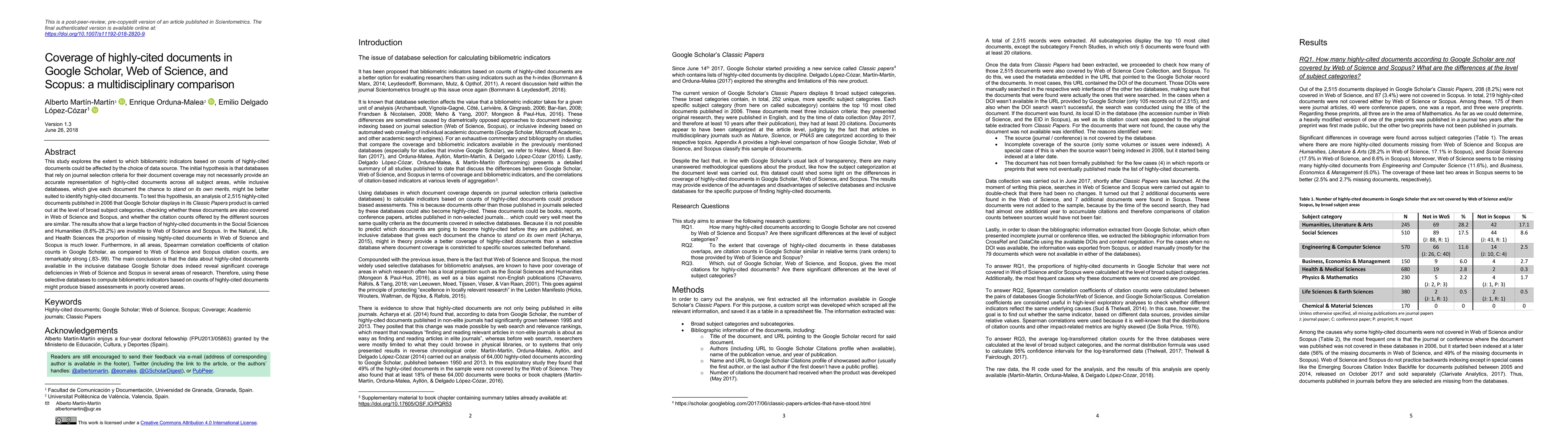This study compares the coverage of highly-cited documents across Google Scholar, Web of Science, and Scopus, finding significant coverage deficiencies in Google Scholar for Social Sciences and Humanities in the other two databases. Despite this, citation count correlations across databases are strong, indicating potential biases in bibliometric indicators computed using selective databases.