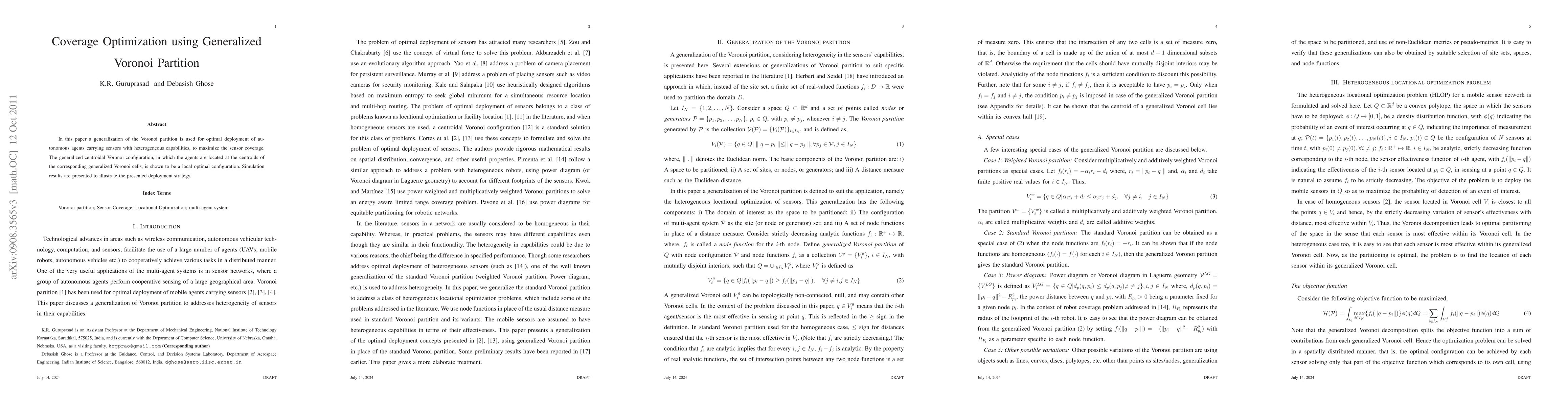 This paper proposes a generalized Voronoi partition for optimal deployment of heterogeneous sensor-carrying autonomous agents to maximize coverage. The generalized centroidal Voronoi configuration is identified as a local optimal deployment strategy, supported by simulation results.