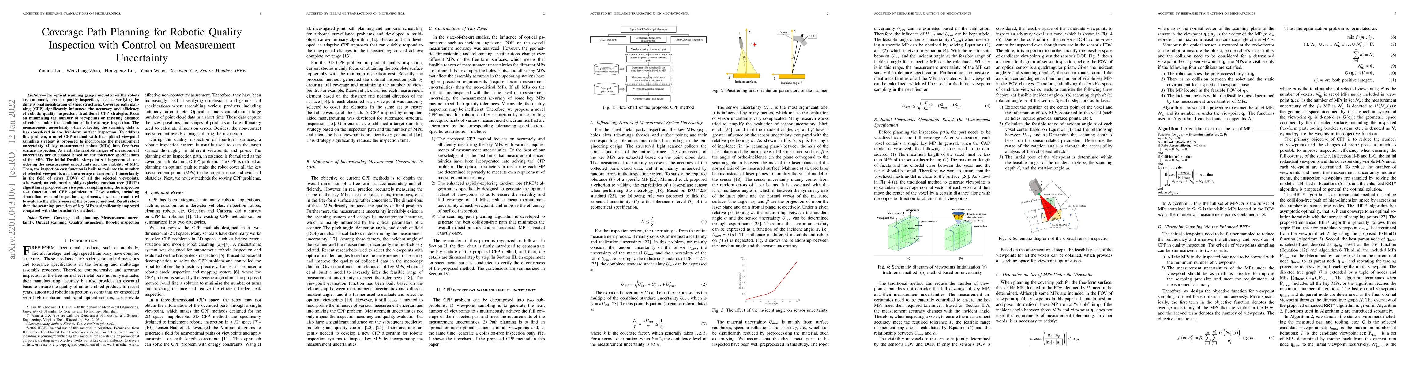 The optical scanning gauges mounted on the robots are commonly used in quality inspection, such as verifying the dimensional specification of sheet structures. Coverage path planning (CPP) significantly influences the accuracy and efficiency of robotic quality inspection. Traditional CPP strategies focus on minimizing the number of viewpoints or traveling distance of robots under the condition of full coverage inspection. The measurement uncertainty when collecting the scanning data is less considered in the free-form surface inspection. To address this problem, a novel CPP method with the optimal viewpoint sampling strategy is proposed to incorporate the measurement uncertainty of key measurement points (MPs) into free-form surface inspection. At first, the feasible ranges of measurement uncertainty are calculated based on the tolerance specifications of the MPs. The initial feasible viewpoint set is generated considering the measurement uncertainty and the visibility of MPs. Then, the inspection cost function is built to evaluate the number of selected viewpoints and the average measurement uncertainty in the field of views (FOVs) of all the selected viewpoints. Afterward, an enhanced rapidly-exploring random tree (RRT*) algorithm is proposed for viewpoint sampling using the inspection cost function and CPP optimization. Case studies, including simulation tests and inspection experiments, have been conducted to evaluate the effectiveness of the proposed method. Results show that the scanning precision of key MPs is significantly improved compared with the benchmark method.