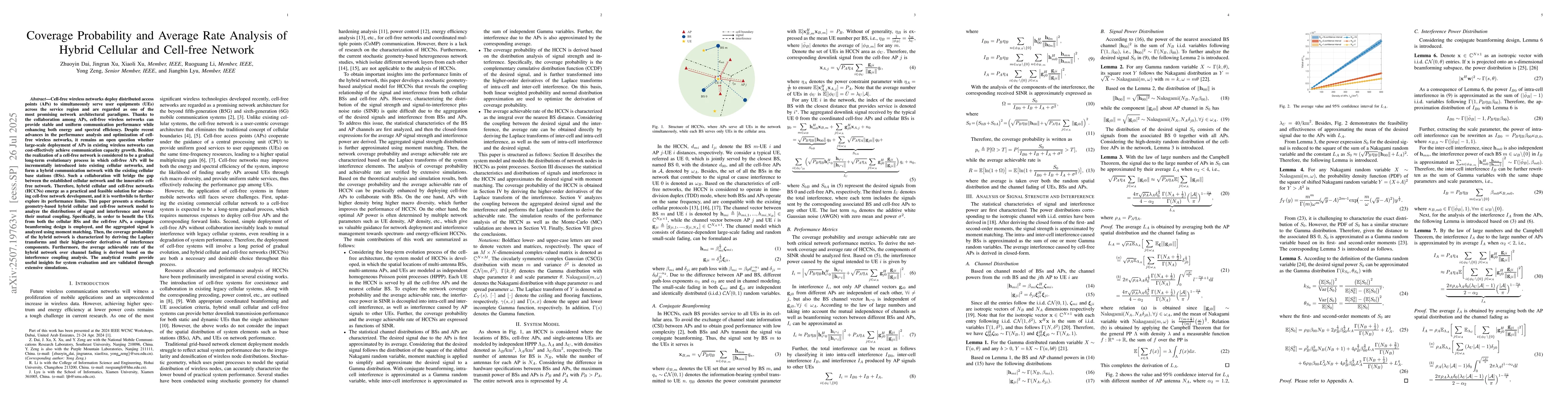 Cell-free wireless networks deploy distributed access points (APs) to simultaneously serve user equipments (UEs) across the service region and are regarded as one of the most promising network architectural paradigms. Despite recent advances in the performance analysis and optimization of cellfree wireless networks, it remains an open question whether large-scale deployment of APs in existing wireless networks can cost-effectively achieve communication capacity growth. Besides, the realization of a cell-free network is considered to be a gradual long-term evolutionary process in which cell-free APs will be incrementally introduced into existing cellular networks, and form a hybrid communication network with the existing cellular base stations (BSs). Such a collaboration will bridge the gap between the established cellular network and the innovative cellfree network. Therefore, hybrid cellular and cell-free networks (HCCNs) emerge as a practical and feasible solution for advancing cell-free network development, and it is worthwhile to further explore its performance limits. This paper presents a stochastic geometry-based hybrid cellular and cell-free network model to analyze the distributions of signal and interference and reveal their mutual coupling. Specifically, in order to benefit the UEs from both the cellular BSs and the cell-free APs, a conjugate beamforming design is employed, and the aggregated signal is analyzed using moment matching. Then, the coverage probability of the hybrid network is characterized by deriving the Laplace transforms and their higher-order derivatives of interference components. Furthermore, the average achievable rate of the hybrid network over channel fading is derived based on the interference coupling analysis.