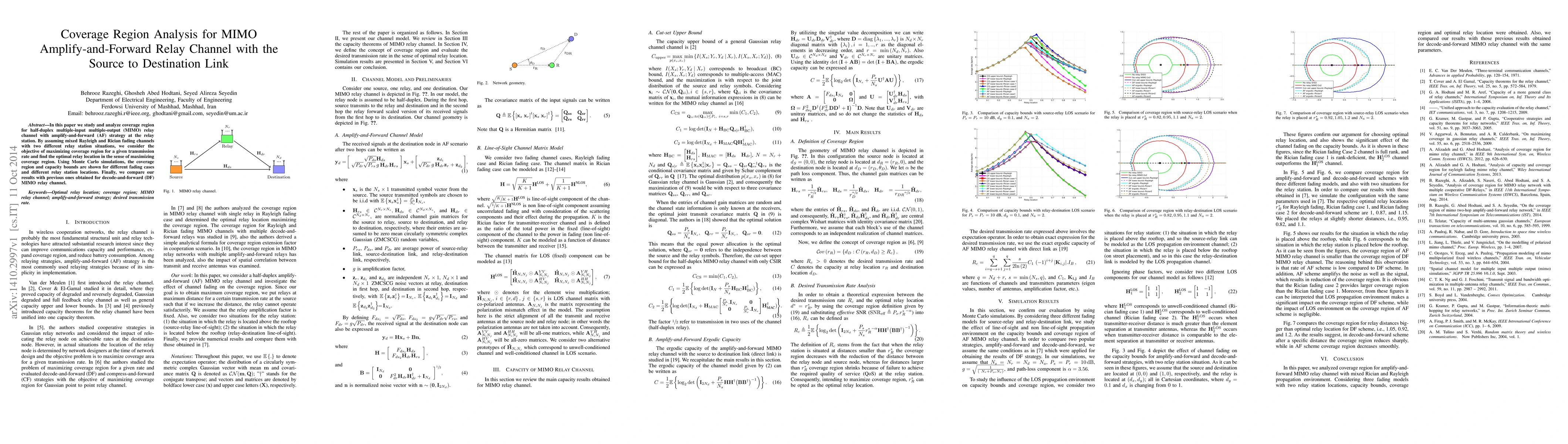 This paper analyzes the coverage region for a half-duplex MIMO amplify-and-forward relay channel, optimizing relay location to maximize coverage for given transmission rates under mixed Rayleigh and Rician fading. Monte Carlo simulations compare coverage and capacity bounds for different relay scenarios and compare results with decode-and-forward MIMO relay channels.