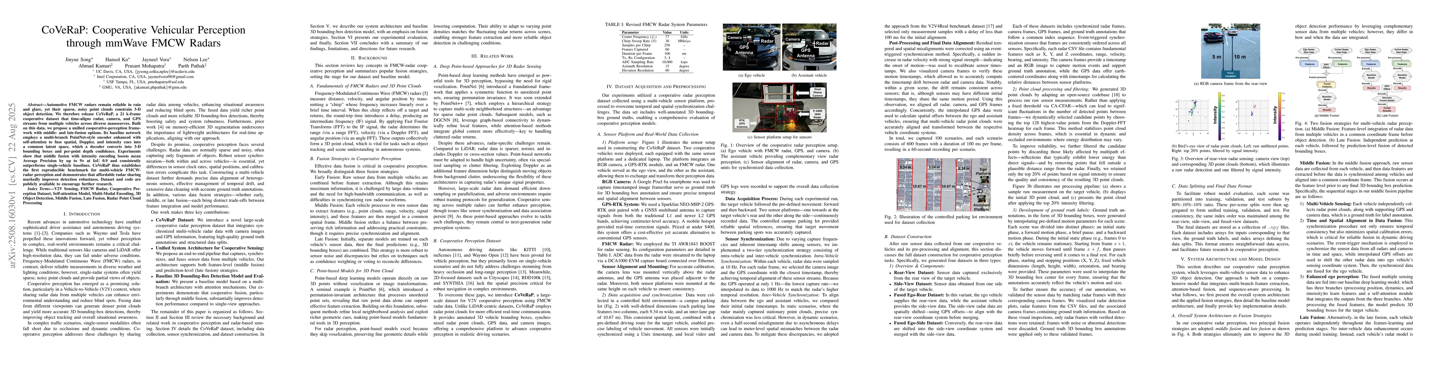 Automotive FMCW radars remain reliable in rain and glare, yet their sparse, noisy point clouds constrain 3-D object detection. We therefore release CoVeRaP, a 21 k-frame cooperative dataset that time-aligns radar, camera, and GPS streams from multiple vehicles across diverse manoeuvres. Built on this data, we propose a unified cooperative-perception framework with middle- and late-fusion options. Its baseline network employs a multi-branch PointNet-style encoder enhanced with self-attention to fuse spatial, Doppler, and intensity cues into a common latent space, which a decoder converts into 3-D bounding boxes and per-point depth confidence. Experiments show that middle fusion with intensity encoding boosts mean Average Precision by up to 9x at IoU 0.9 and consistently outperforms single-vehicle baselines. CoVeRaP thus establishes the first reproducible benchmark for multi-vehicle FMCW-radar perception and demonstrates that affordable radar sharing markedly improves detection robustness. Dataset and code are publicly available to encourage further research.