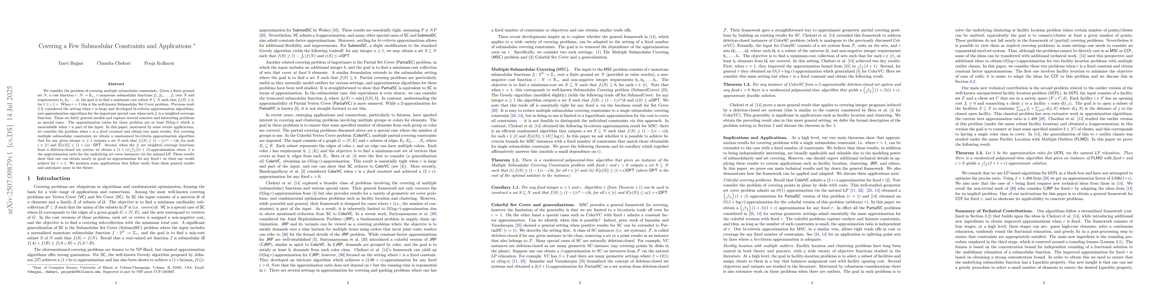 We consider the problem of covering multiple submodular constraints. Given a finite ground set $N$, a cost function $c: N \rightarrow \mathbb{R}_+$, $r$ monotone submodular functions $f_1,f_2,\ldots,f_r$ over $N$ and requirements $b_1,b_2,\ldots,b_r$ the goal is to find a minimum cost subset $S \subseteq N$ such that $f_i(S) \ge b_i$ for $1 \le i \le r$. When $r=1$ this is the well-known Submodular Set Cover problem. Previous work \cite{chekuri2022covering} considered the setting when $r$ is large and developed bi-criteria approximation algorithms, and approximation algorithms for the important special case when each $f_i$ is a weighted coverage function. These are fairly general models and capture several concrete and interesting problems as special cases. The approximation ratios for these problem are at least $\Omega(\log r)$ which is unavoidable when $r$ is part of the input. In this paper, motivated by some recent applications, we consider the problem when $r$ is a \emph{fixed constant} and obtain two main results. For covering multiple submodular constraints we obtain a randomized bi-criteria approximation algorithm that for any given integer $\alpha \ge 1$ outputs a set $S$ such that $f_i(S) \ge$ $(1-1/e^\alpha -\epsilon)b_i$ for each $i \in [r]$ and $\mathbb{E}[c(S)] \le (1+\epsilon)\alpha \cdot \sf{OPT}$. Second, when the $f_i$ are weighted coverage functions from a deletion-closed set system we obtain a $(1+\epsilon)$ $(\frac{e}{e-1})$ $(1+\beta)$-approximation where $\beta$ is the approximation ratio for the underlying set cover instances via the natural LP. These results show that one can obtain nearly as good an approximation for any fixed $r$ as what one would achieve for $r=1$. We mention some applications that follow easily from these general results and anticipate more in the future.