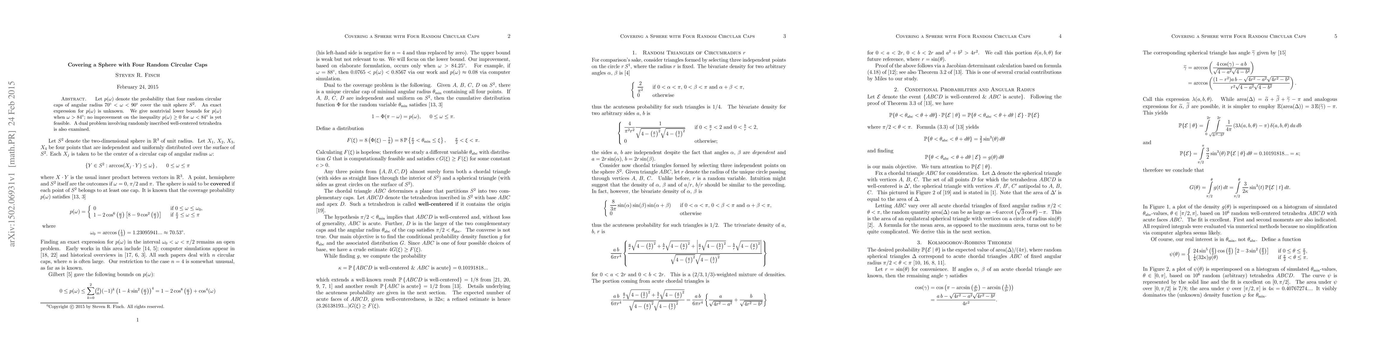 This paper explores the probability p(w) that four random circular caps can cover a unit sphere, focusing on angular radii between 70 and 90 degrees. It provides nontrivial lower bounds for p(w) when w is greater than 84 degrees, and examines a dual problem involving randomly inscribed tetrahedra, without finding an exact expression for p(w) or significant improvement for w less than 84 degrees.
