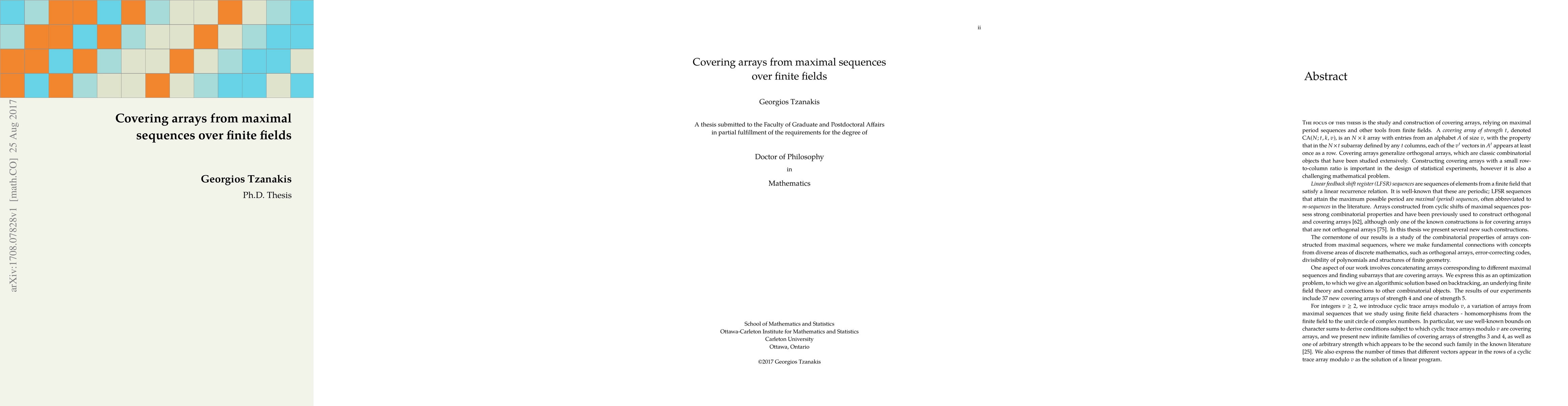 The focus of this thesis is the study and construction of covering arrays, relying on maximal period sequences and other tools from finite fields. A covering array of strength $t$, denoted $\mathrm{CA}(N; t, k,v)$, is an $N\times k$ array with entries from an alphabet $A$ of size $v$, with the property that in the $N\times t$ subarray defined by any $t$ columns, each of the $v^t$ vectors in $A^t$ appears at least once as a row. Covering arrays generalize orthogonal arrays, which are classic combinatorial objects that have been studied extensively. Constructing covering arrays with a small row-to-column ratio is important in the design of statistical experiments, however it is also a challenging mathematical problem. Linear feedback shift register (LFSR) sequences are sequences of elements from a finite field that satisfy a linear recurrence relation. It is well-known that these are periodic; LFSR sequences that attain the maximum possible period are maximal (period) sequences, often abbreviated to m-sequences in the literature. Arrays constructed from cyclic shifts of maximal sequences possess strong combinatorial properties and have been previously used to construct orthogonal and covering arrays (Moura et al., 2016), although only one of the known constructions is for covering arrays that are not orthogonal arrays (Raaphorst et al., 2014). In this thesis we present several new such constructions. The cornerstone of our results is a study of the combinatorial properties of arrays constructed from maximal sequences, where we make fundamental connections with concepts from diverse areas of discrete mathematics, such as orthogonal arrays, error-correcting codes, divisibility of polynomials and structures of finite geometry. One aspect of our work involves [..]