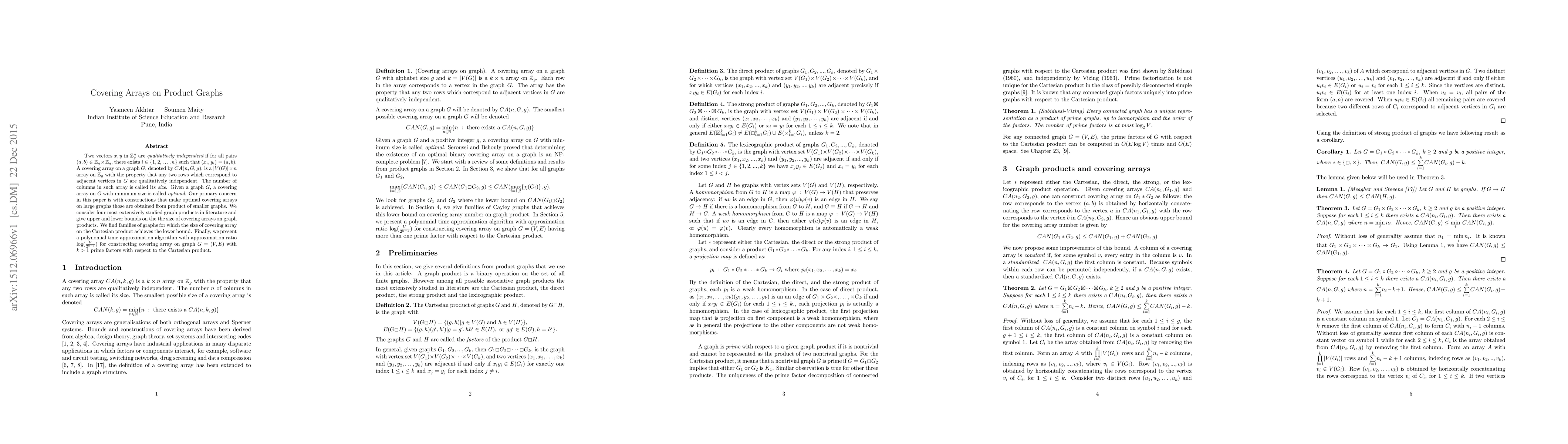 This paper investigates the construction of optimal covering arrays on product graphs, focusing on the Cartesian product. It provides upper and lower bounds for the size of covering arrays on various graph products, identifies families of graphs achieving the lower bound, and presents a polynomial time approximation algorithm for constructing such arrays with an approximation ratio of $\log(\frac{V}{2^{k-1}})$ for graphs with $k$ prime factors.