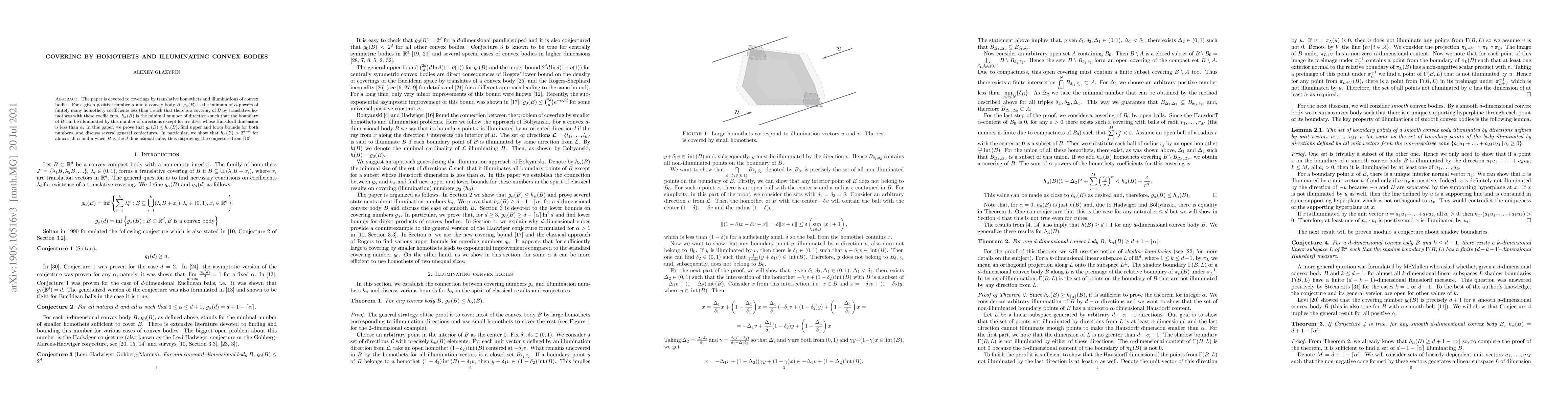 This paper investigates covering convex bodies using translative homothets and their illumination. It establishes that the minimum number of directions needed to illuminate a convex body's boundary is greater than a specific function of its dimension, thereby disproving a related conjecture.