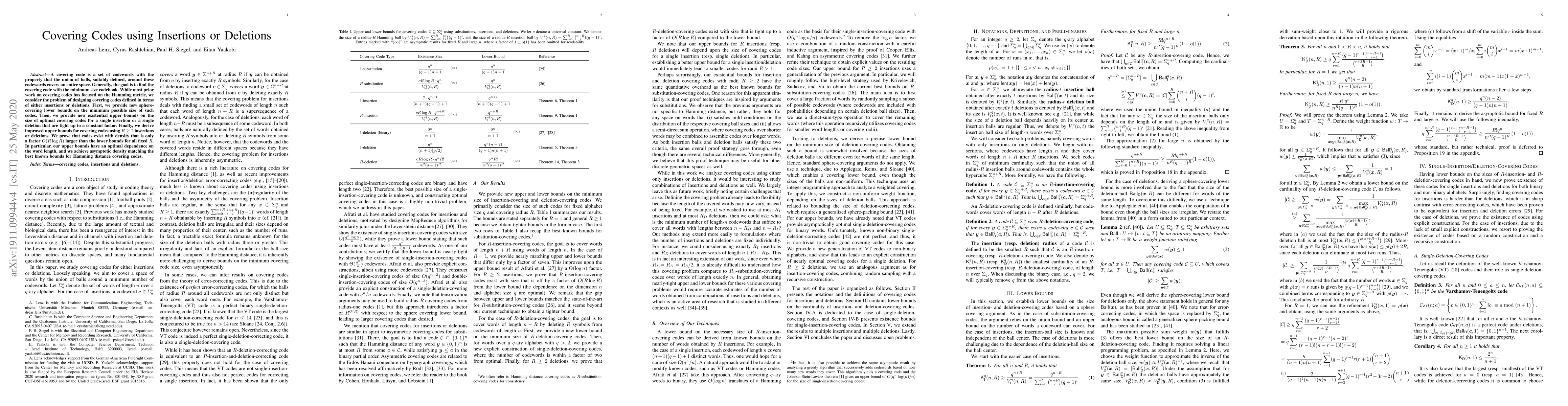 This paper investigates covering codes based on insertions or deletions, providing new sphere-covering lower bounds and tight existential upper bounds for single insertions or deletions. It also derives improved upper bounds for codes with multiple insertions or deletions, showing optimal density scaling with the number of modifications.