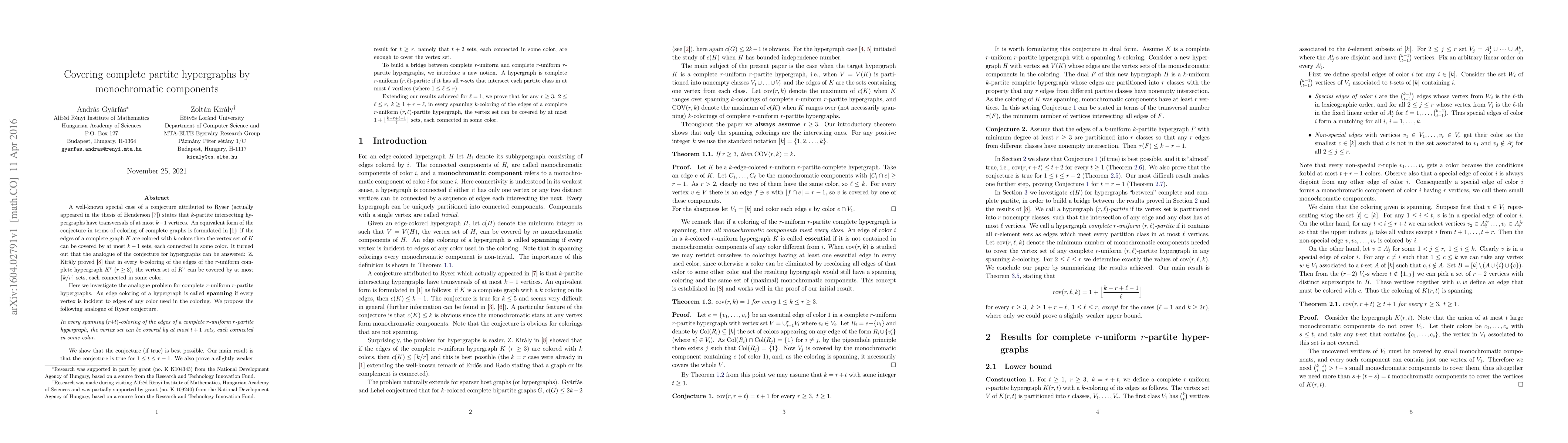 This paper investigates the conjecture related to covering complete r-uniform r-partite hypergraphs by monochromatic components under edge coloring. The main result confirms the conjecture for 1 ≤ t ≤ r-1, while a slightly weaker result is shown for t ≥ r. Additionally, the authors introduce the concept of complete r-uniform (r,l)-partite hypergraphs and extend their results to this new framework.