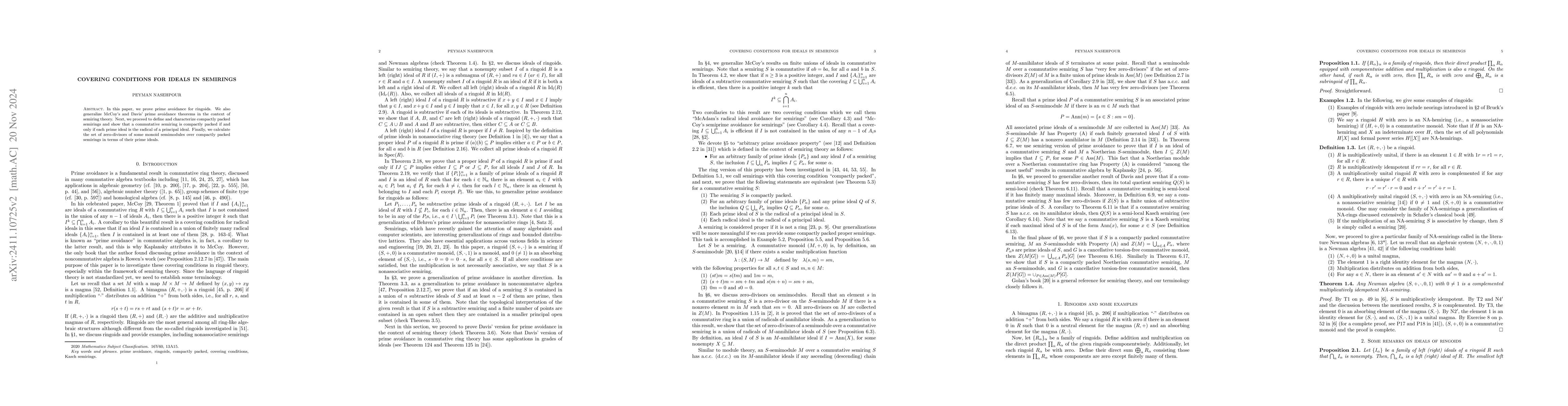 In this paper, we prove prime avoidance for ringoids. We also generalize McCoy's and Davis' prime avoidance theorems in the context of semiring theory. Next, we proceed to define and characterize compactly packed semirings and show that a commutative semiring is compactly packed if and only if each prime ideal is the radical of a principal ideal. Finally, we calculate the set of zero-divisors of some monoid semimodules over compactly packed semirings in terms of their prime ideals.