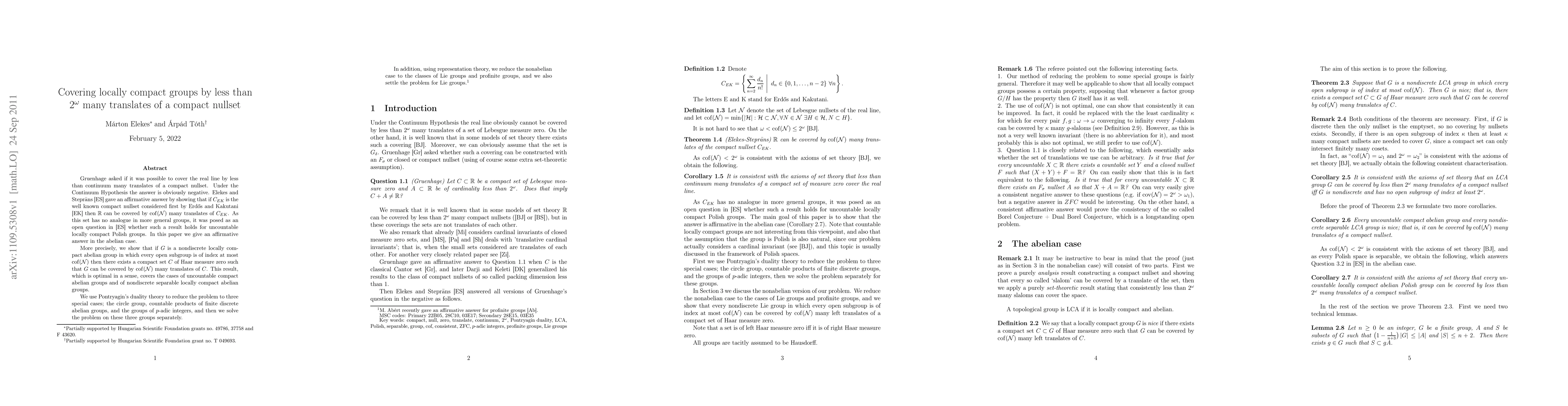 Gruenhage asked if it was possible to cover the real line by less than continuum many translates of a compact nullset. Under the Continuum Hypothesis the answer is obviously negative. Elekes and Stepr\=ans gave an affirmative answer by showing that if $C_{EK}$ is the well known compact nullset considered first by Erd\H os and Kakutani then $\RR$ can be covered by $\cof(\iN)$ many translates of $C_{EK}$. As this set has no analogue in more general groups, it was posed as an open question whether such a result holds for uncountable locally compact Polish groups. In this paper we give an affirmative answer in the abelian case. More precisely, we show that if $G$ is a nondiscrete locally compact abelian group in which every open subgroup is of index at most $\cof(\iN)$ then there exists a compact set $C$ of Haar measure zero such that $G$ can be covered by $\cof(\iN)$ many translates of $C$. This result, which is optimal in a sense, covers the cases of uncountable compact abelian groups and of nondiscrete separable locally compact abelian groups. We use Pontryagin's duality theory to reduce the problem to three special cases; the circle group, countable products of finite discrete abelian groups, and the groups of $p$-adic integers, and then we solve the problem on these three groups separately. In addition, using representation theory, we reduce the nonabelian case to the classes of Lie groups and profinite groups, and we also settle the problem for Lie groups. We remark that M.~Ab\'ert recently gave an affirmative answer for profinite groups.