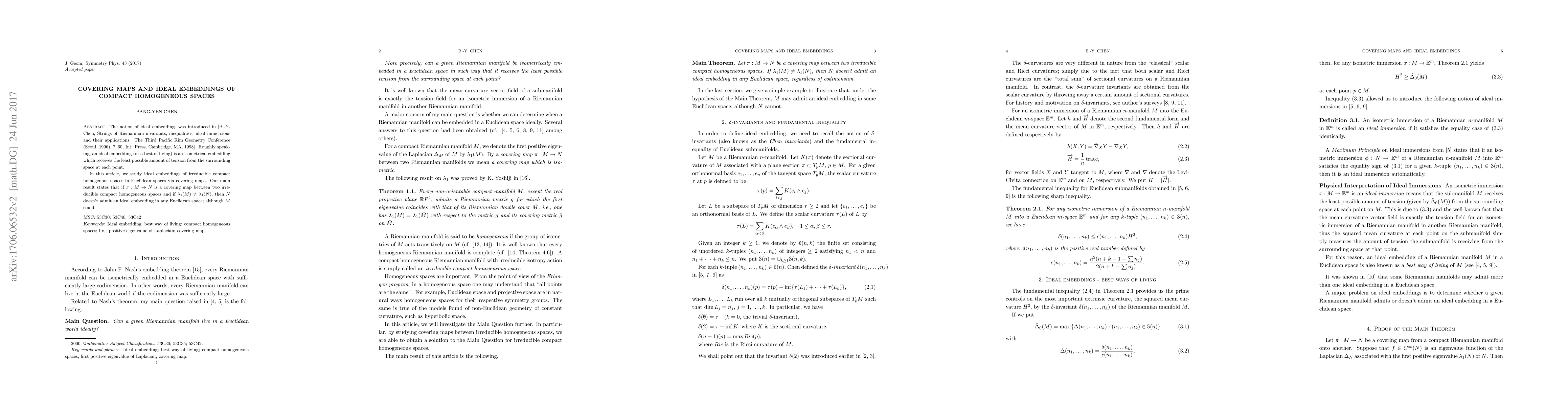 The paper introduces and applies δ-invariants and the fundamental inequality to establish conditions for ideal embeddings of compact homogeneous spaces in Euclidean spaces via covering maps.