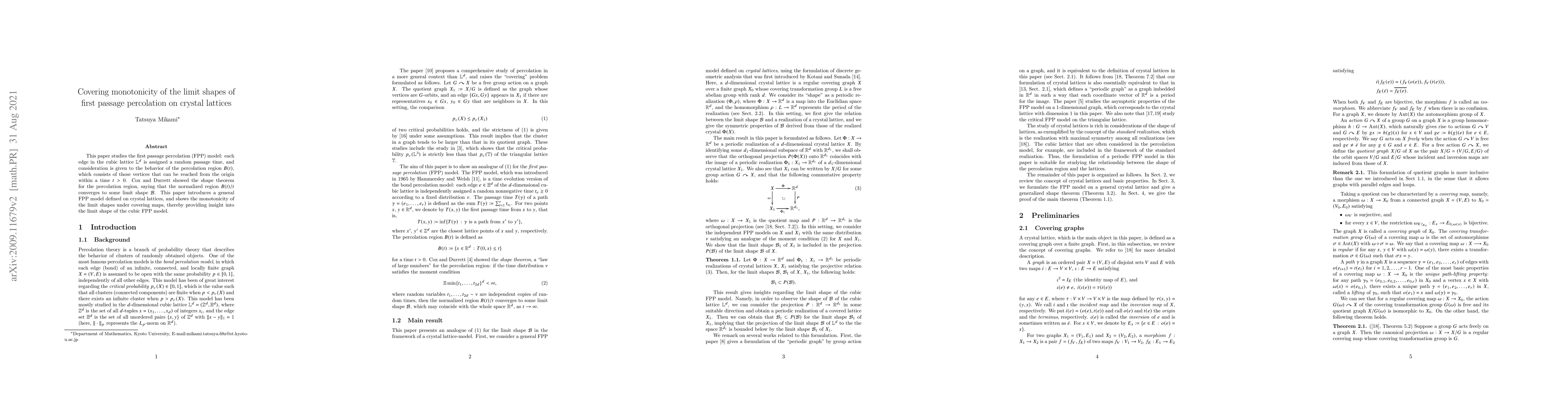 This paper investigates the first passage percolation model on crystal lattices, demonstrating the monotonicity of limit shapes under covering maps, which provides deeper insight into the behavior of the cubic lattice's percolation region. The study extends the shape theorem to general crystal lattices, revealing the convergence of normalized percolation regions to a limit shape.