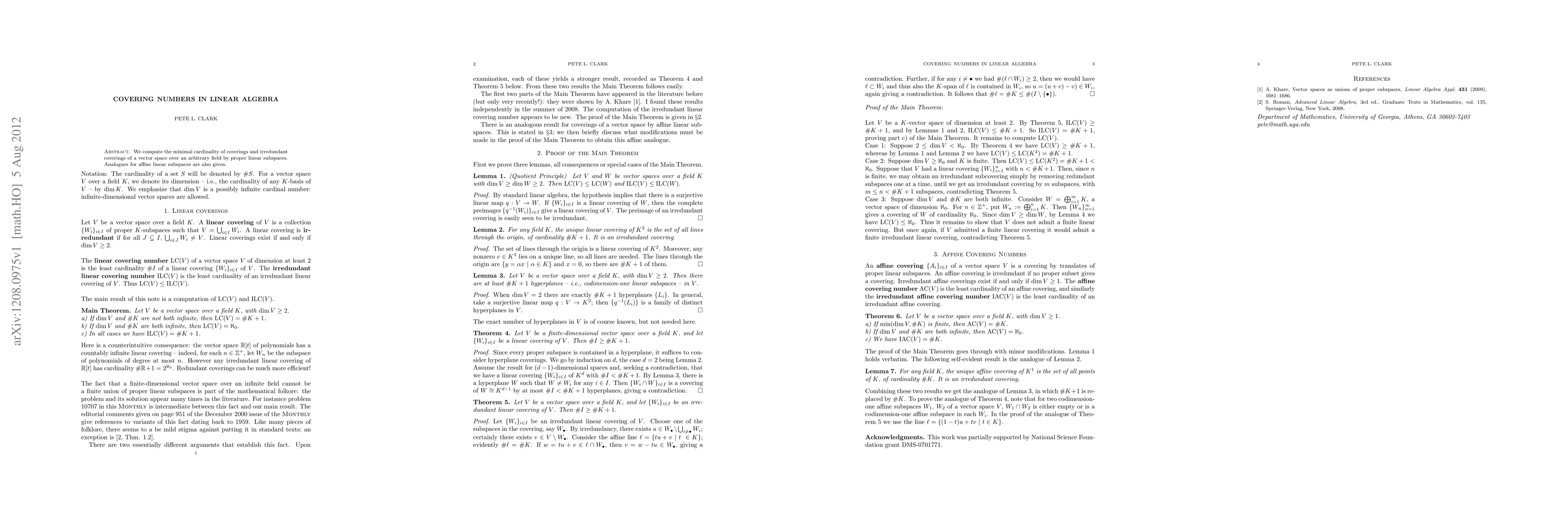 We compute the minimal cardinality of a covering (resp. an irredundant covering) of a vector space over an arbitrary field by proper linear subspaces. Analogues for affine linear subspaces are also given.